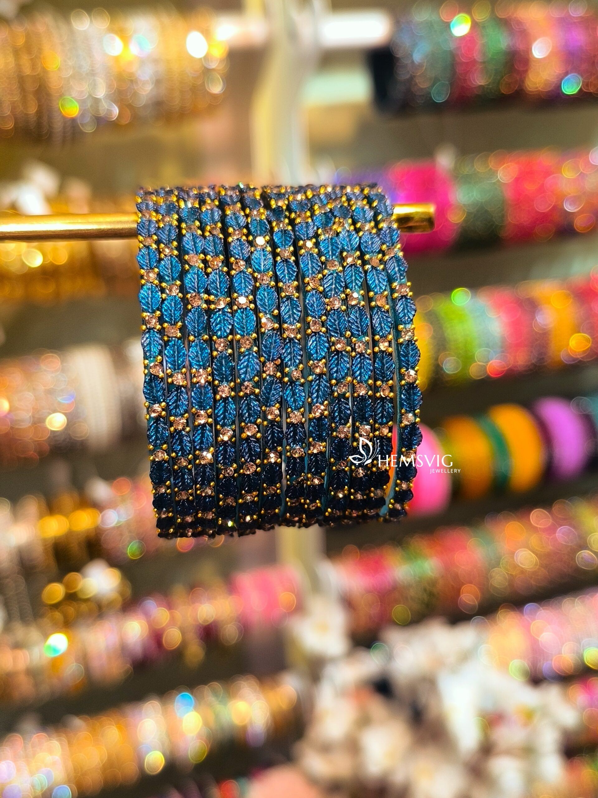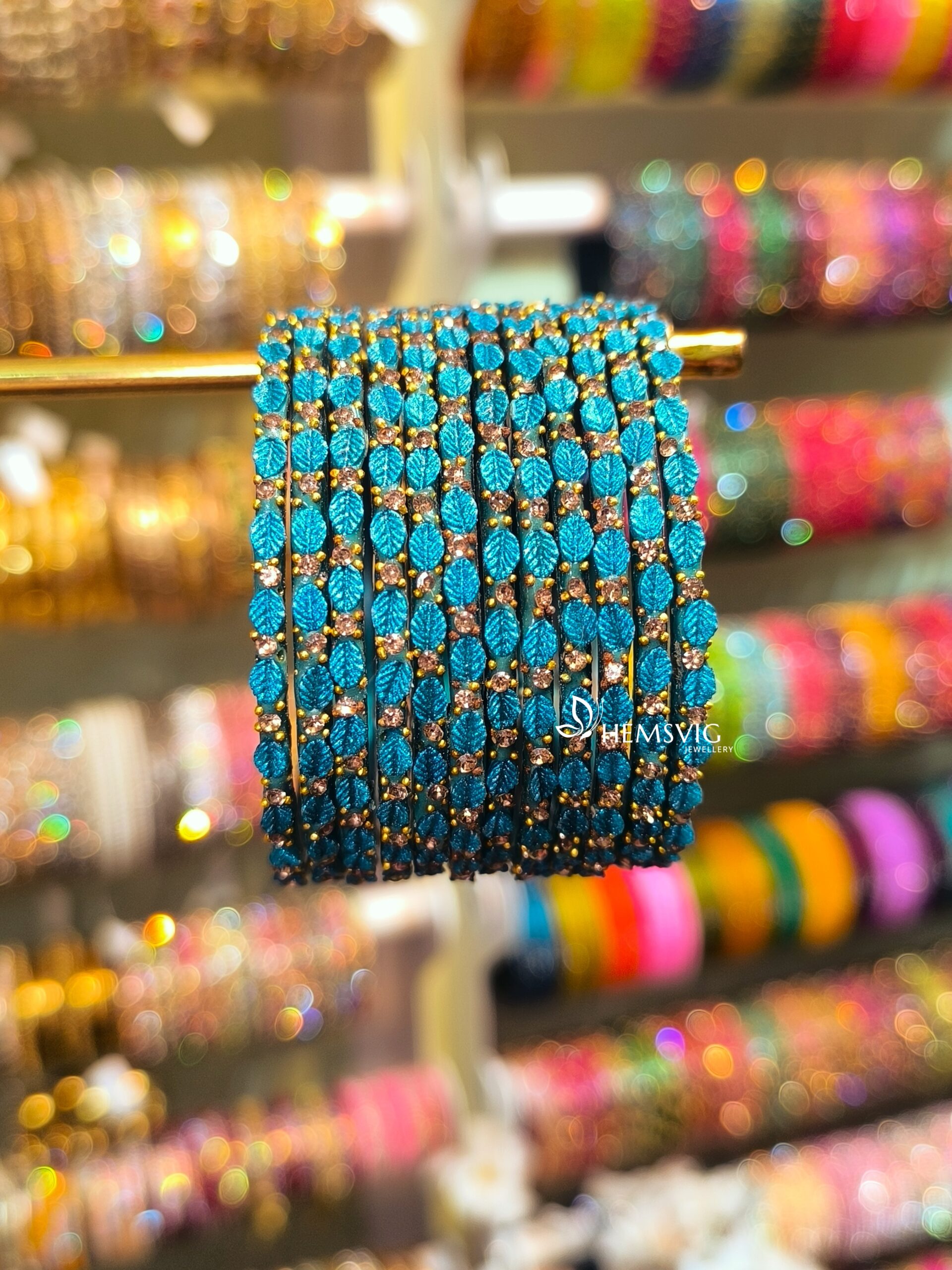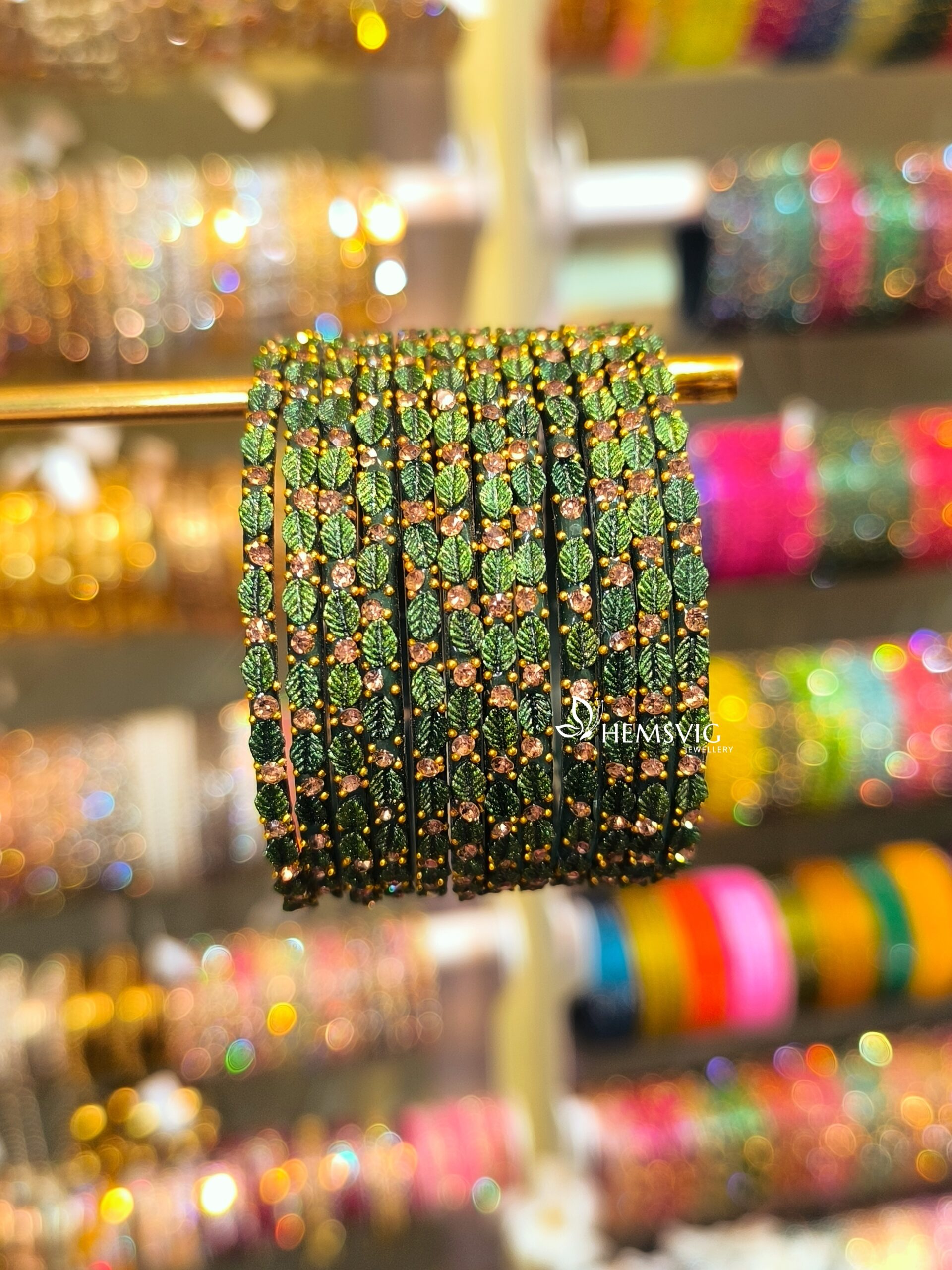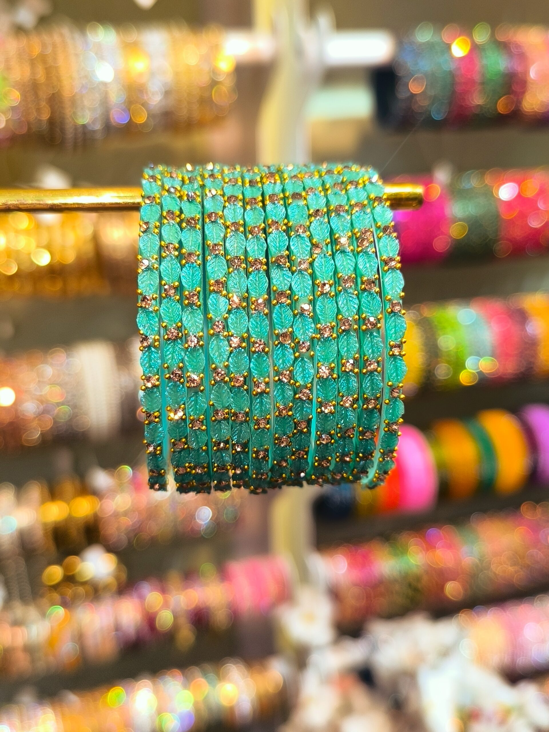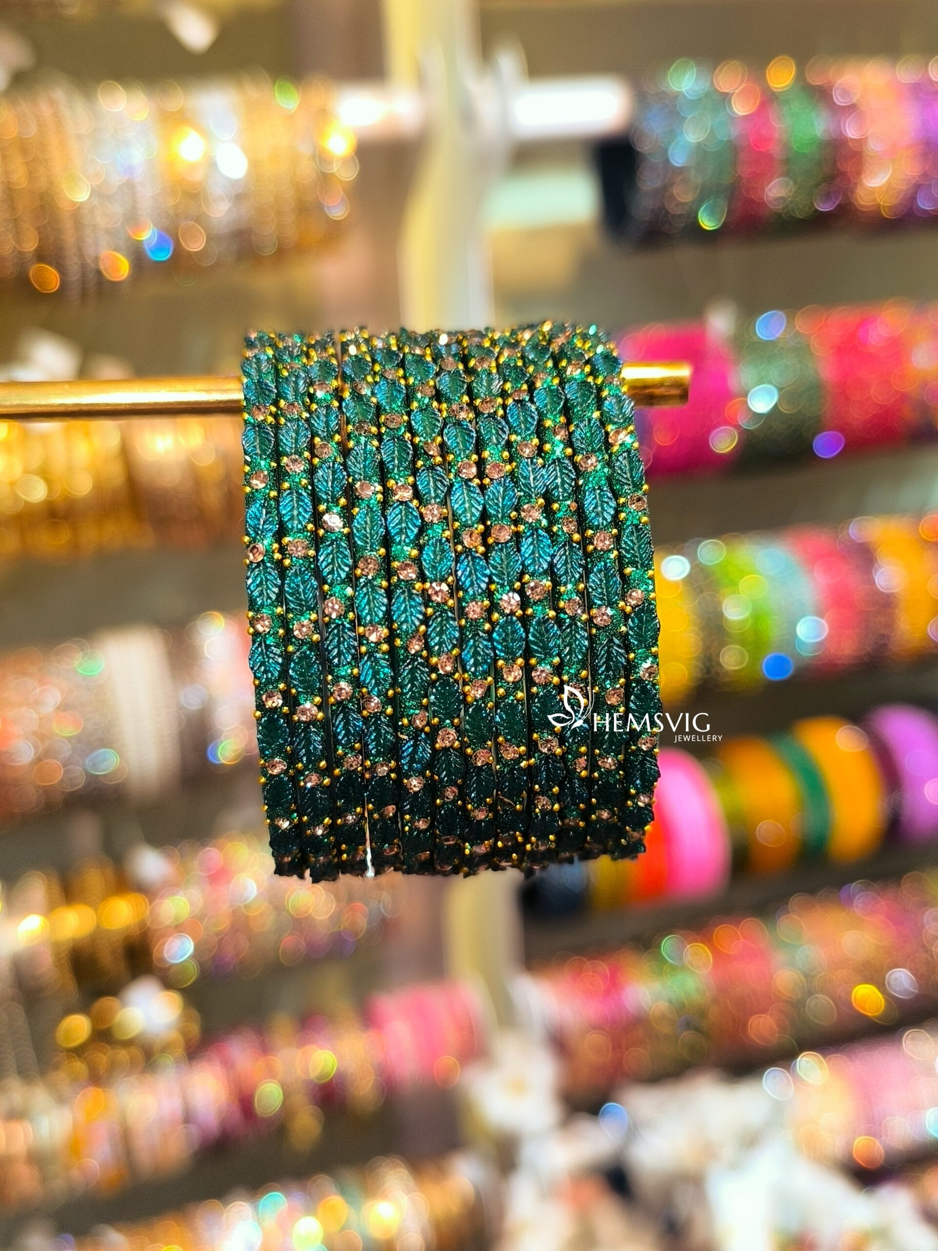 Enhance your traditional look with our Leaf Elegance Glass Bangles, thoughtfully designed to blend charm and craftsmanship. Each bangle features a graceful leaf pattern decorated with shimmering stones and fine beads, adding a refined sparkle to your wrists.
