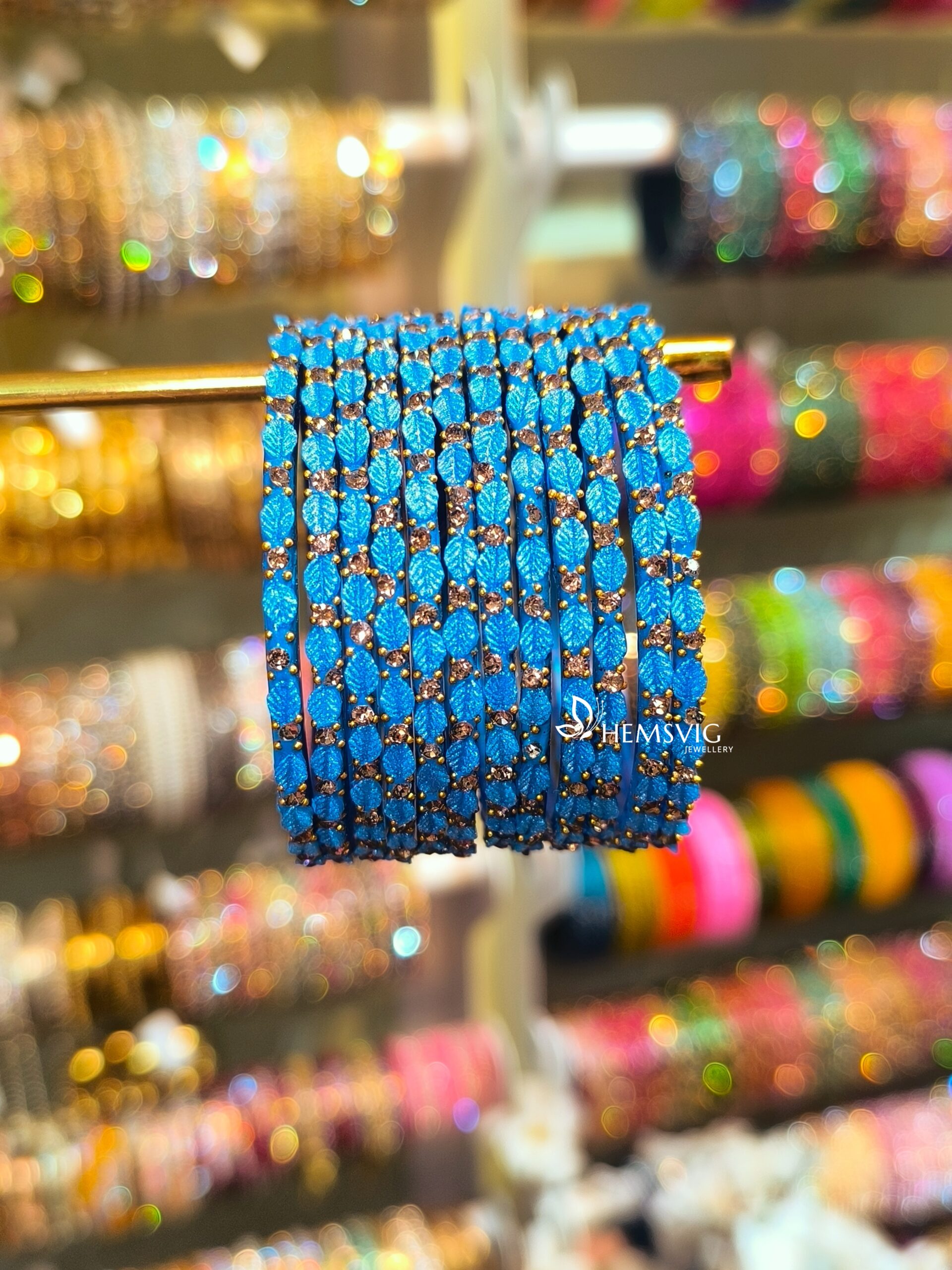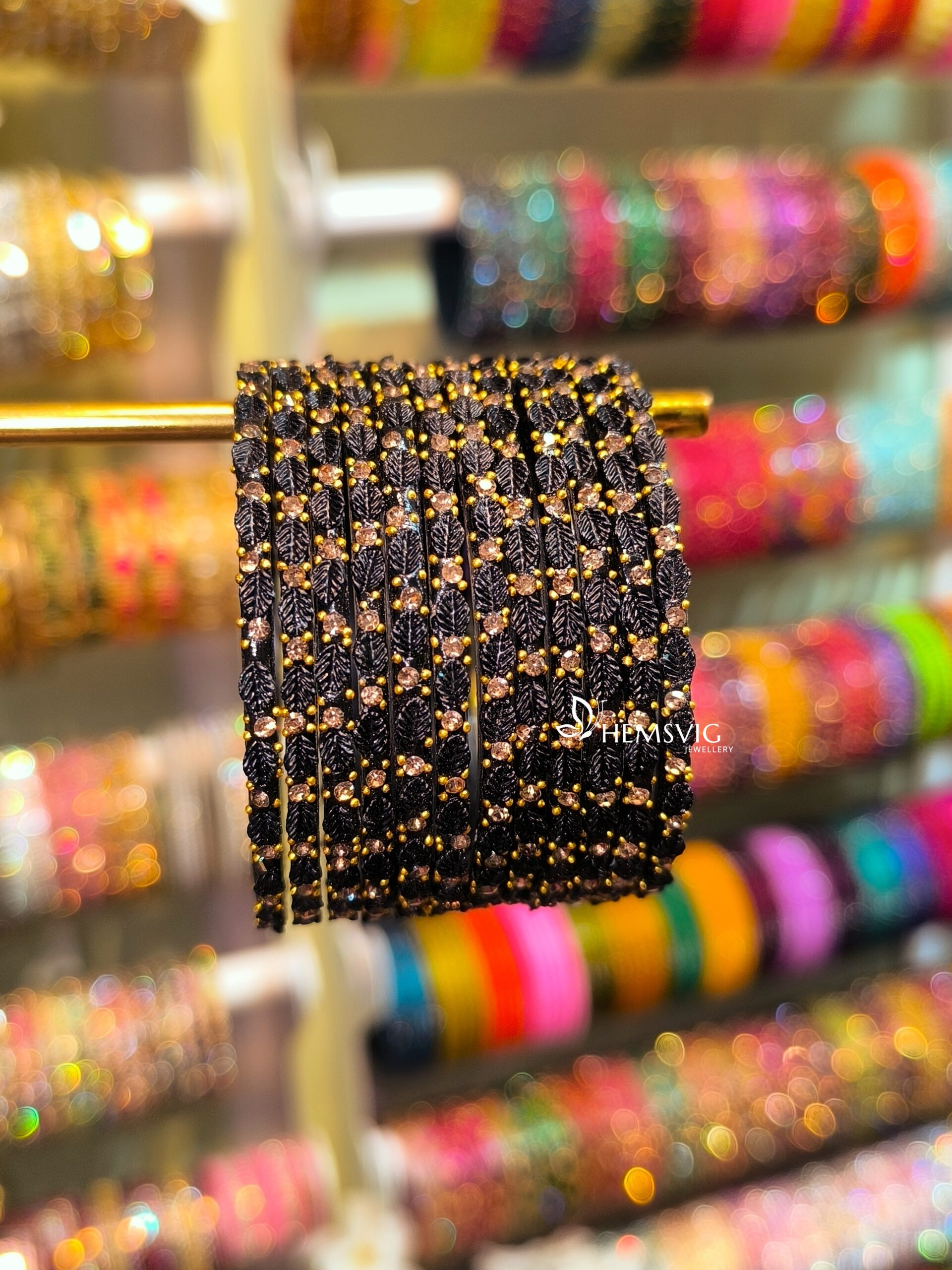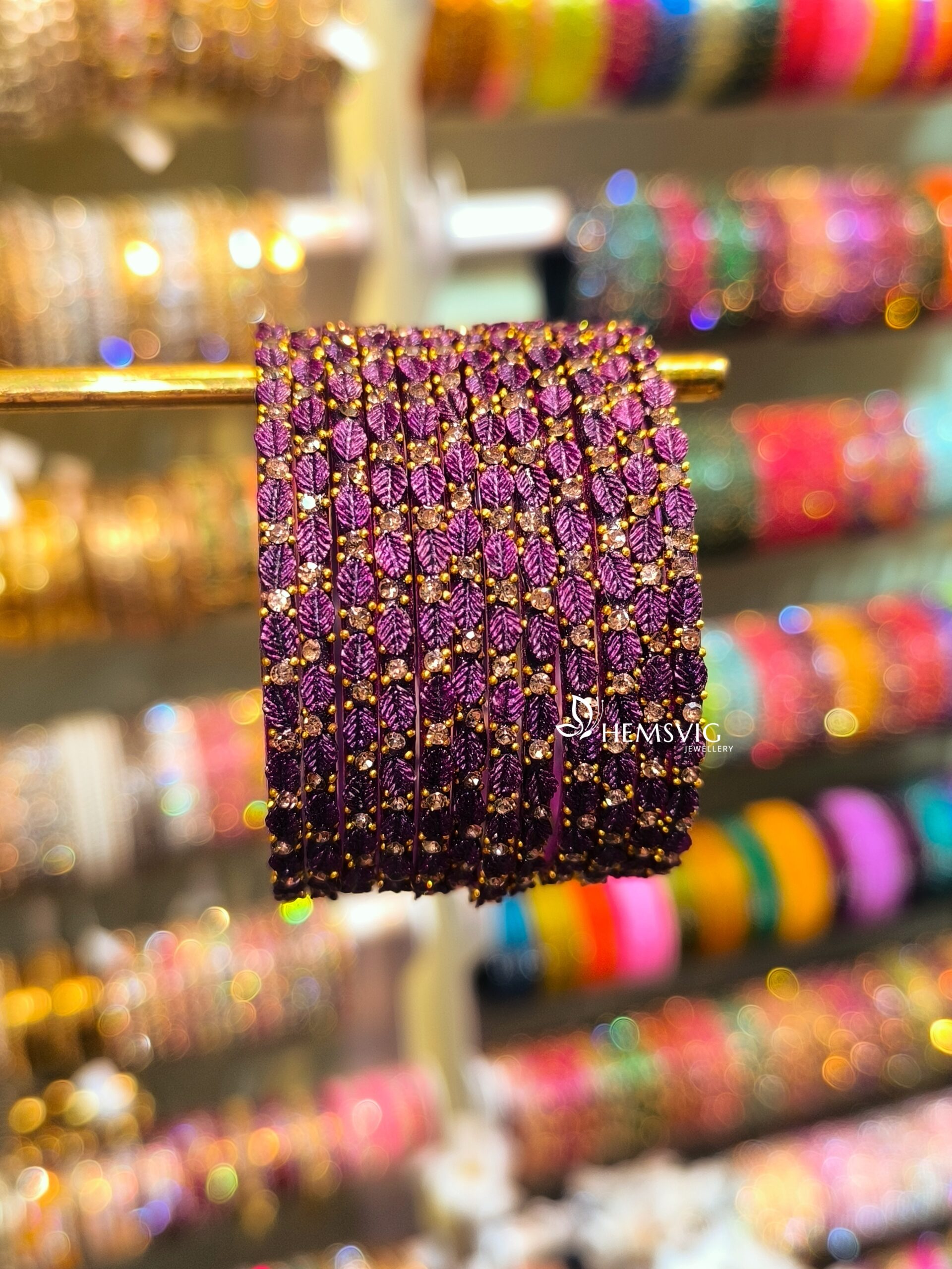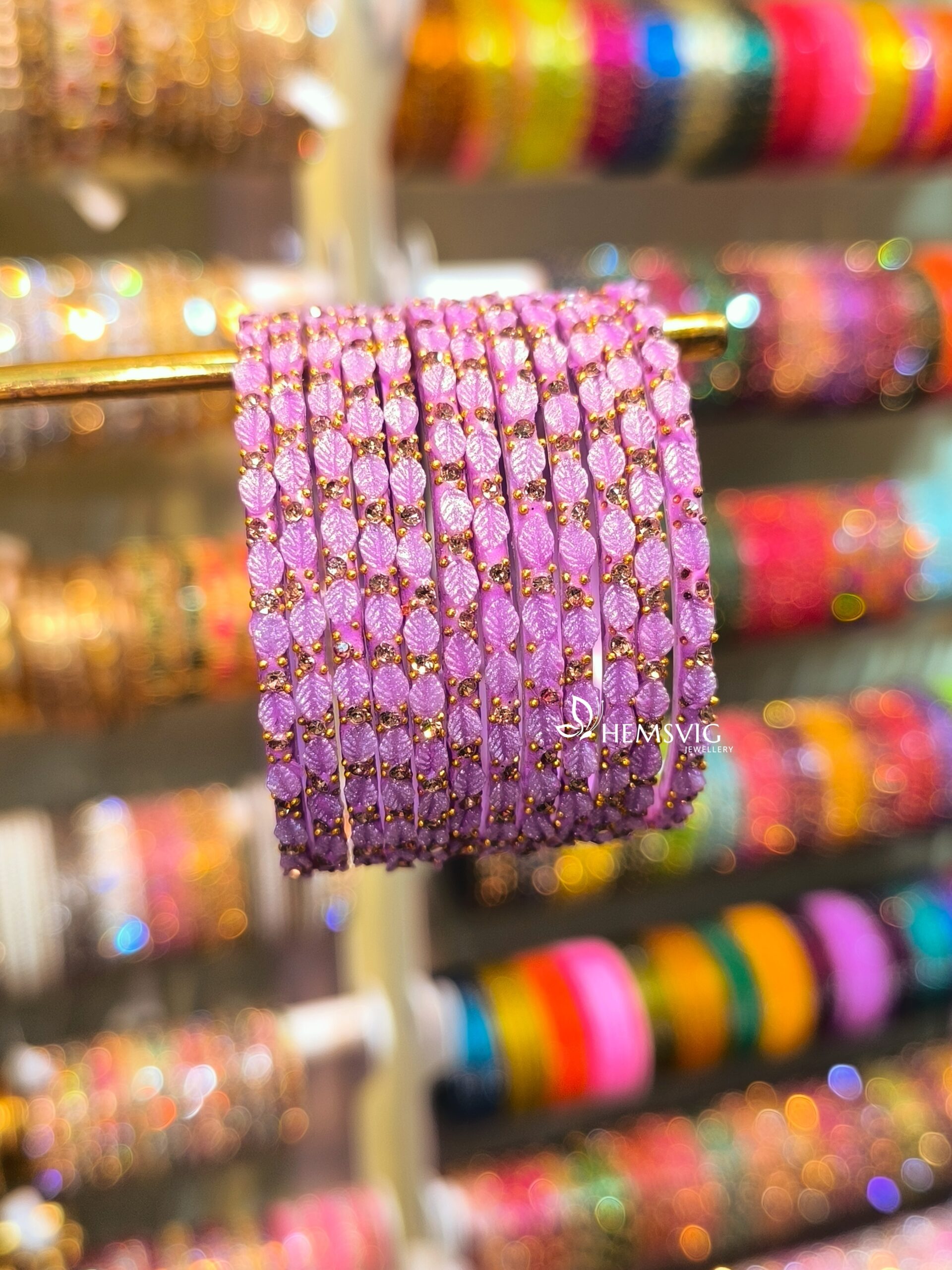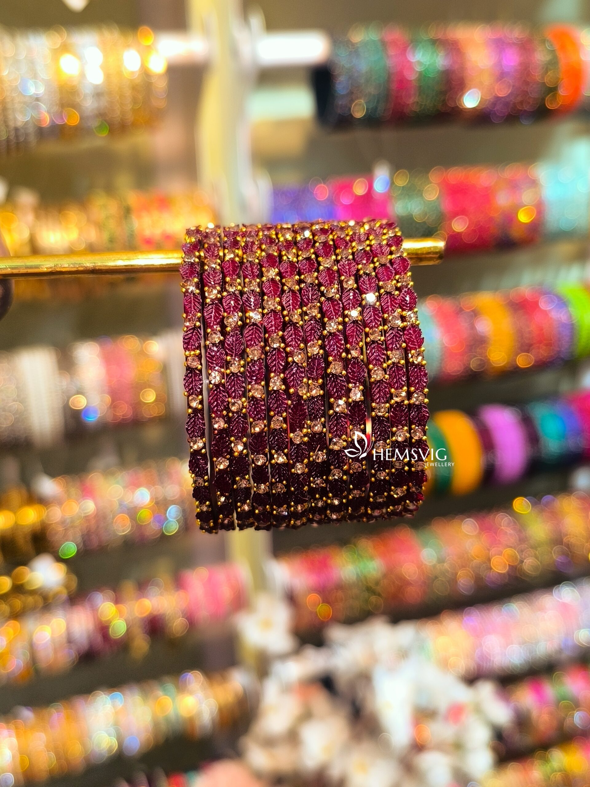 Enhance your traditional look with our Leaf Elegance Glass Bangles, thoughtfully designed to blend charm and craftsmanship. Each bangle features a graceful leaf pattern decorated with shimmering stones and fine beads, adding a refined sparkle to your wrists.