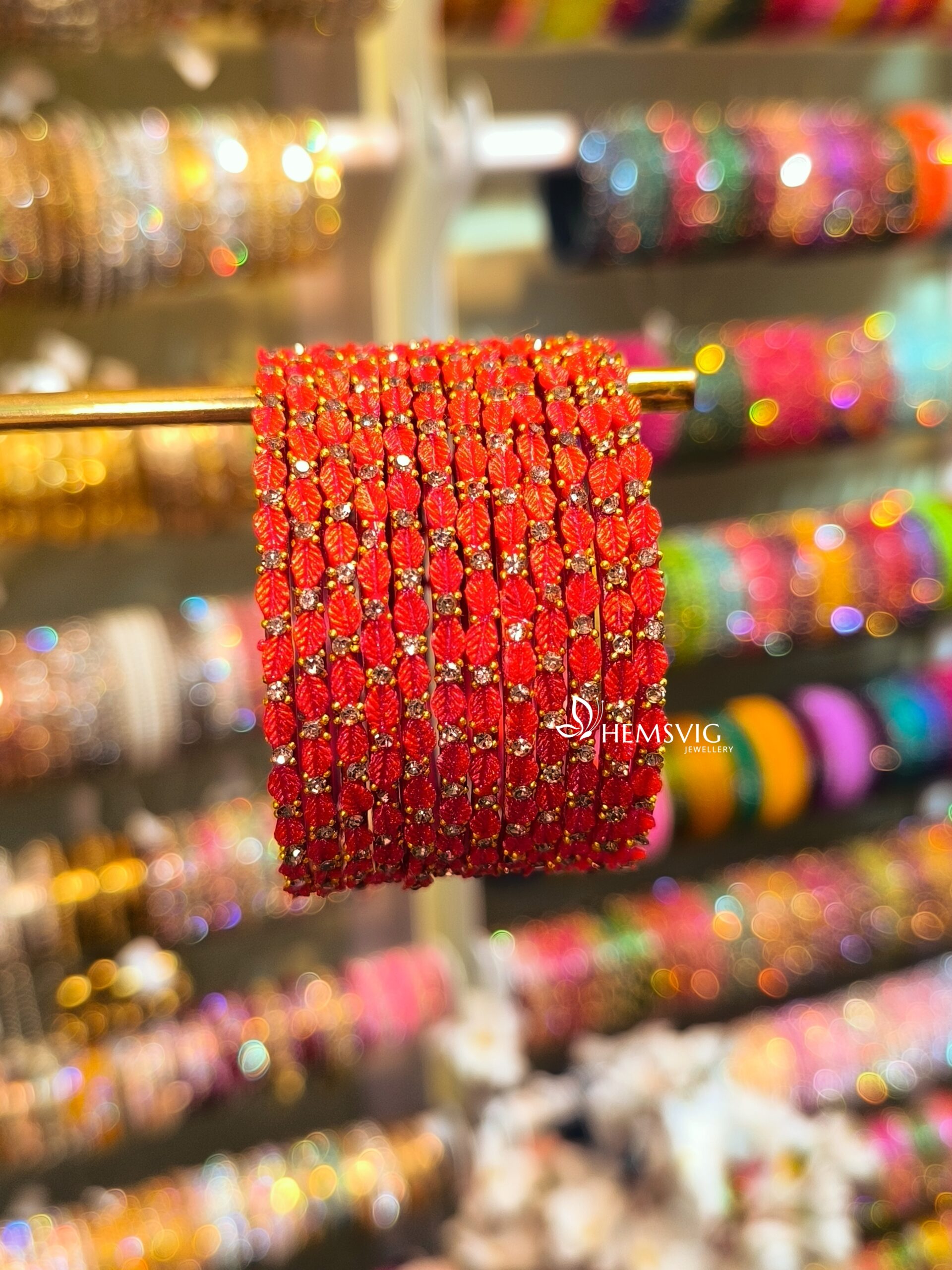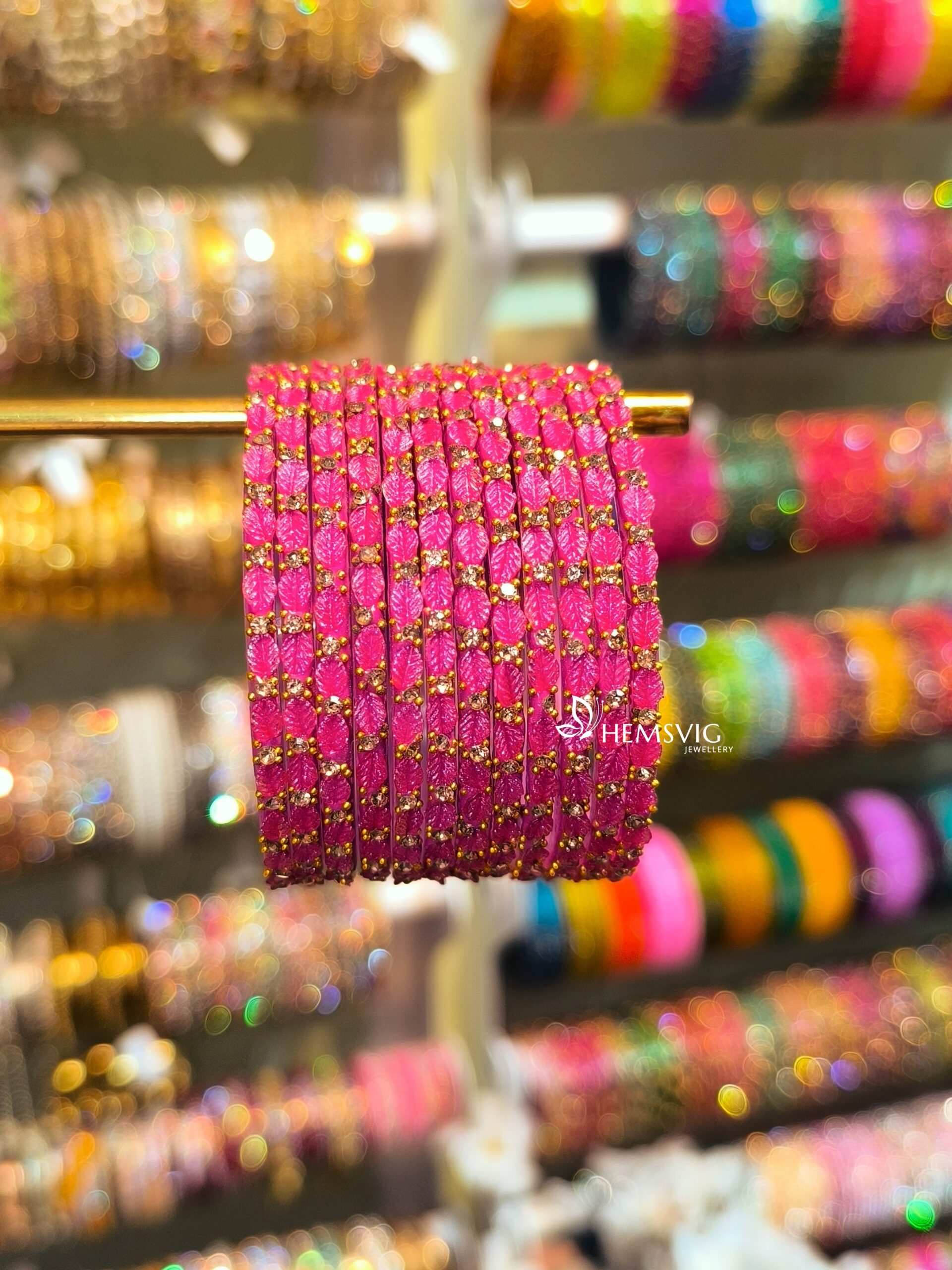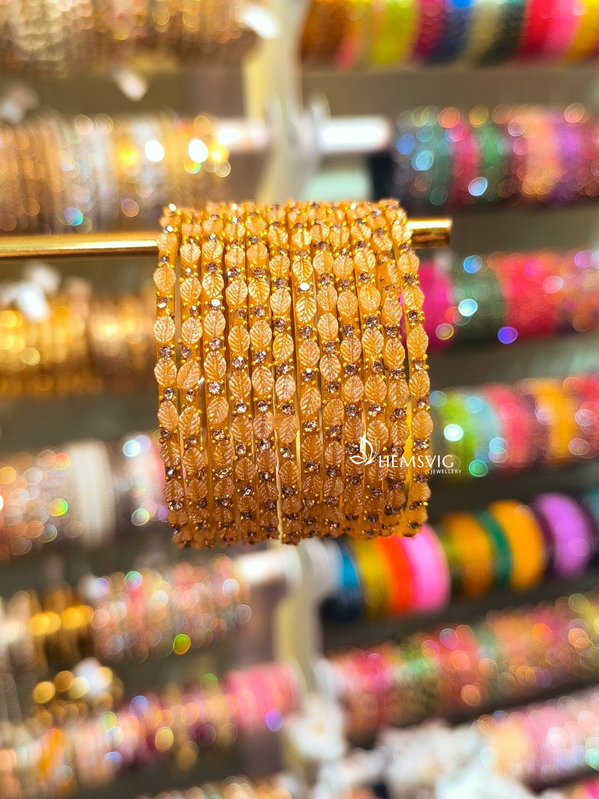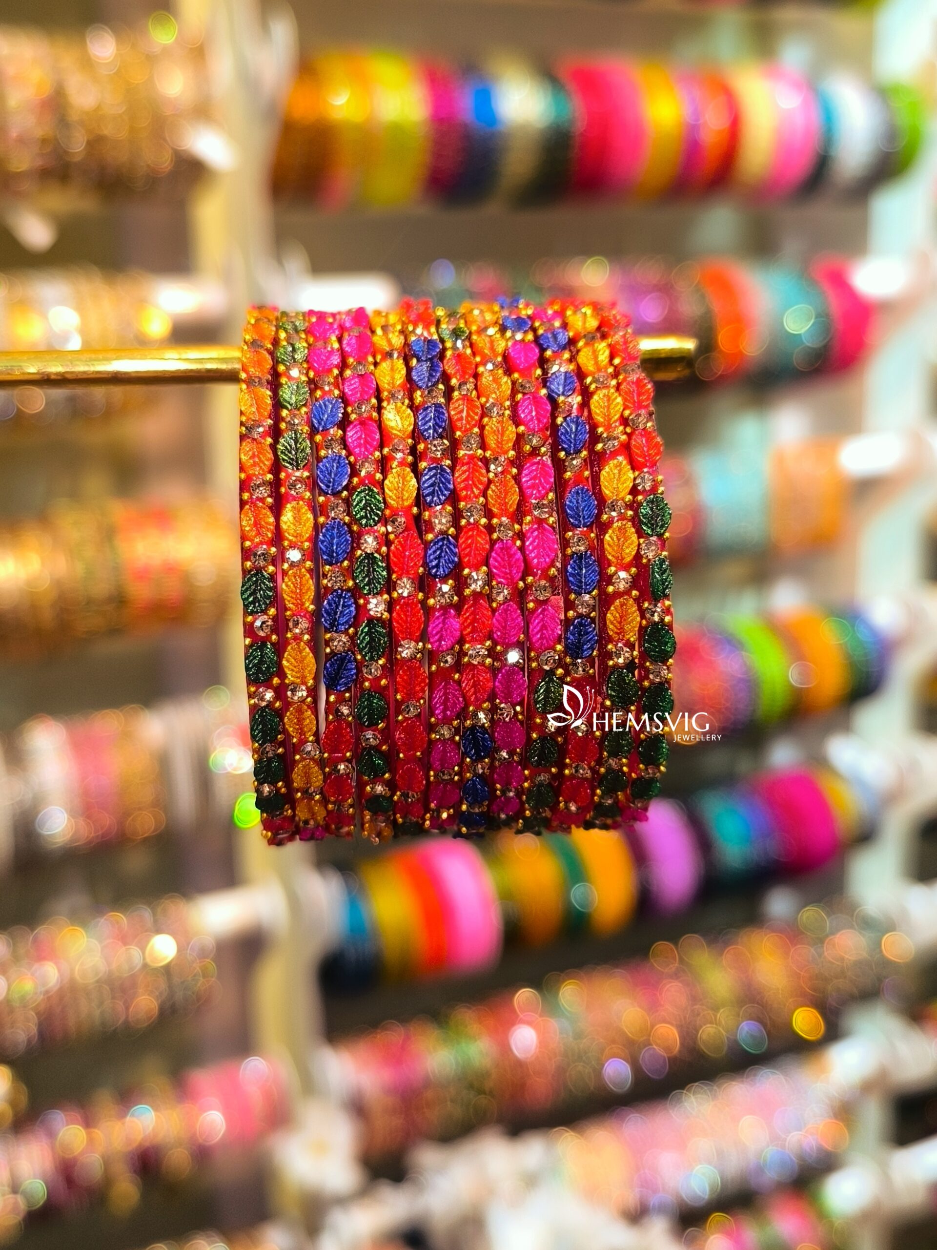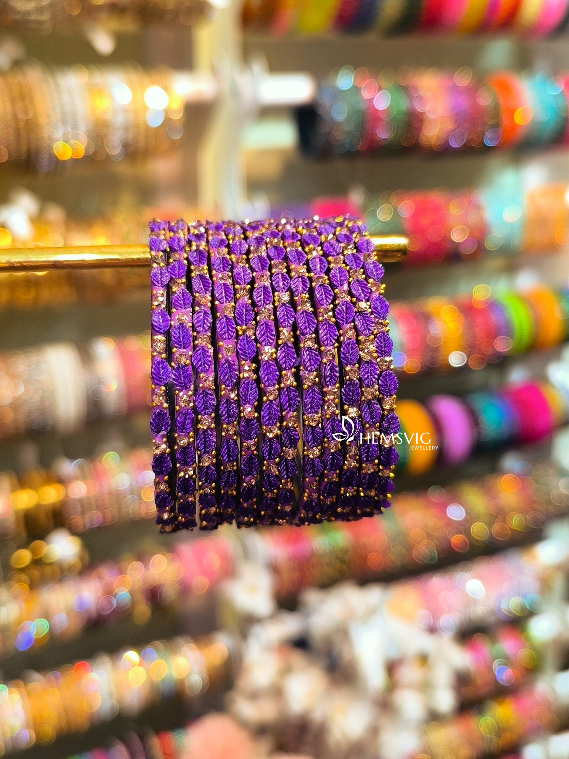 Enhance your traditional look with our Leaf Elegance Glass Bangles, thoughtfully designed to blend charm and craftsmanship. Each bangle features a graceful leaf pattern decorated with shimmering stones and fine beads, adding a refined sparkle to your wrists.