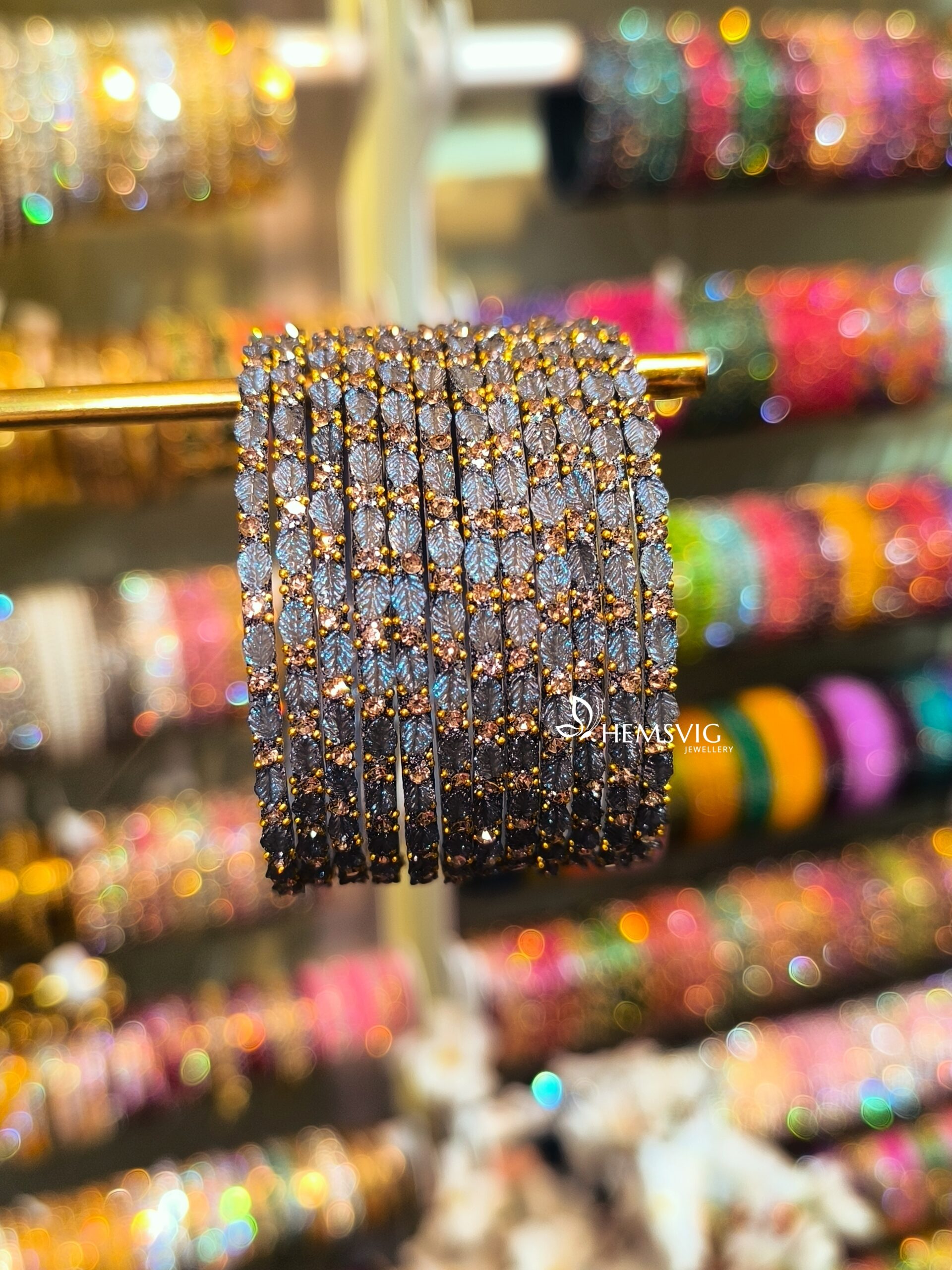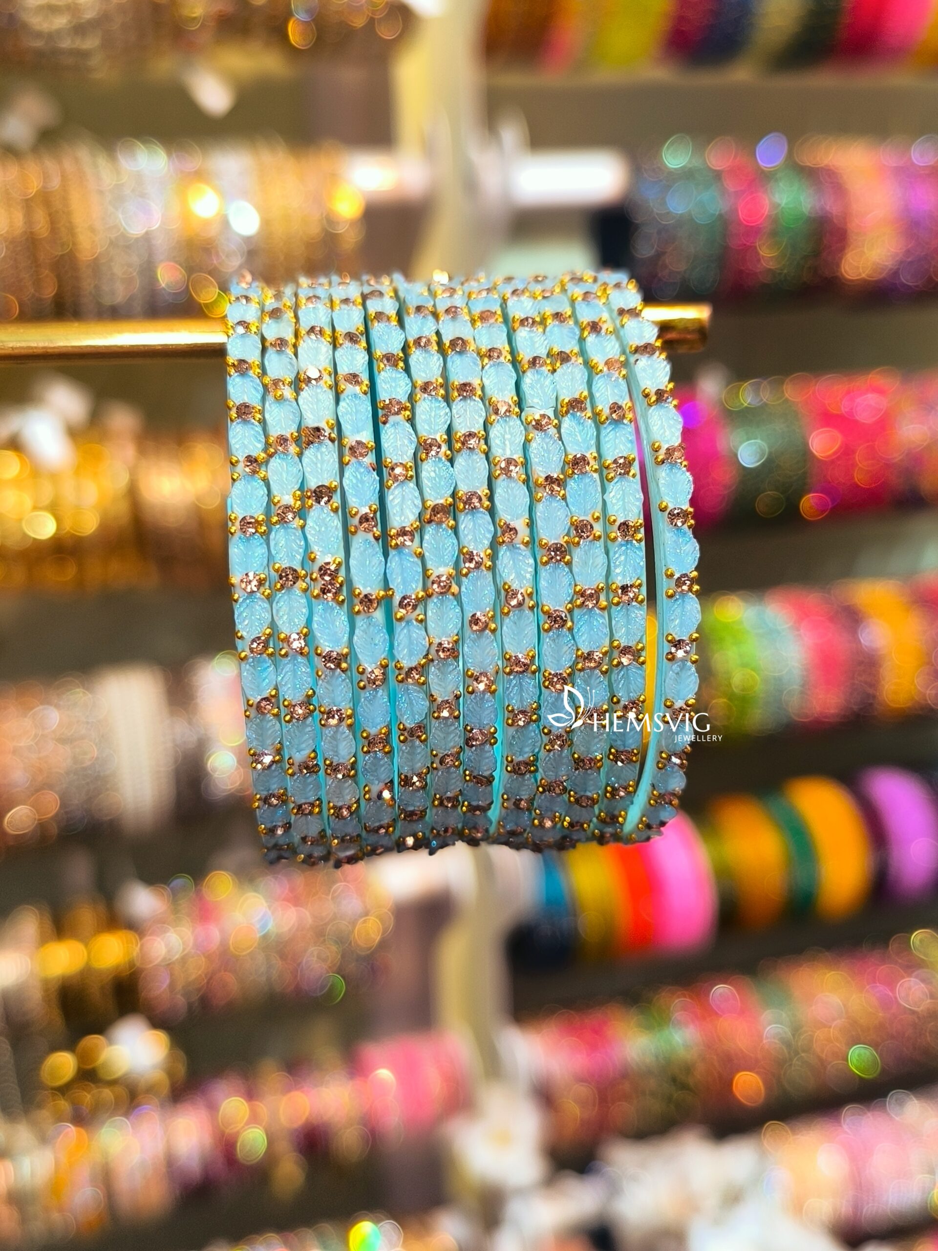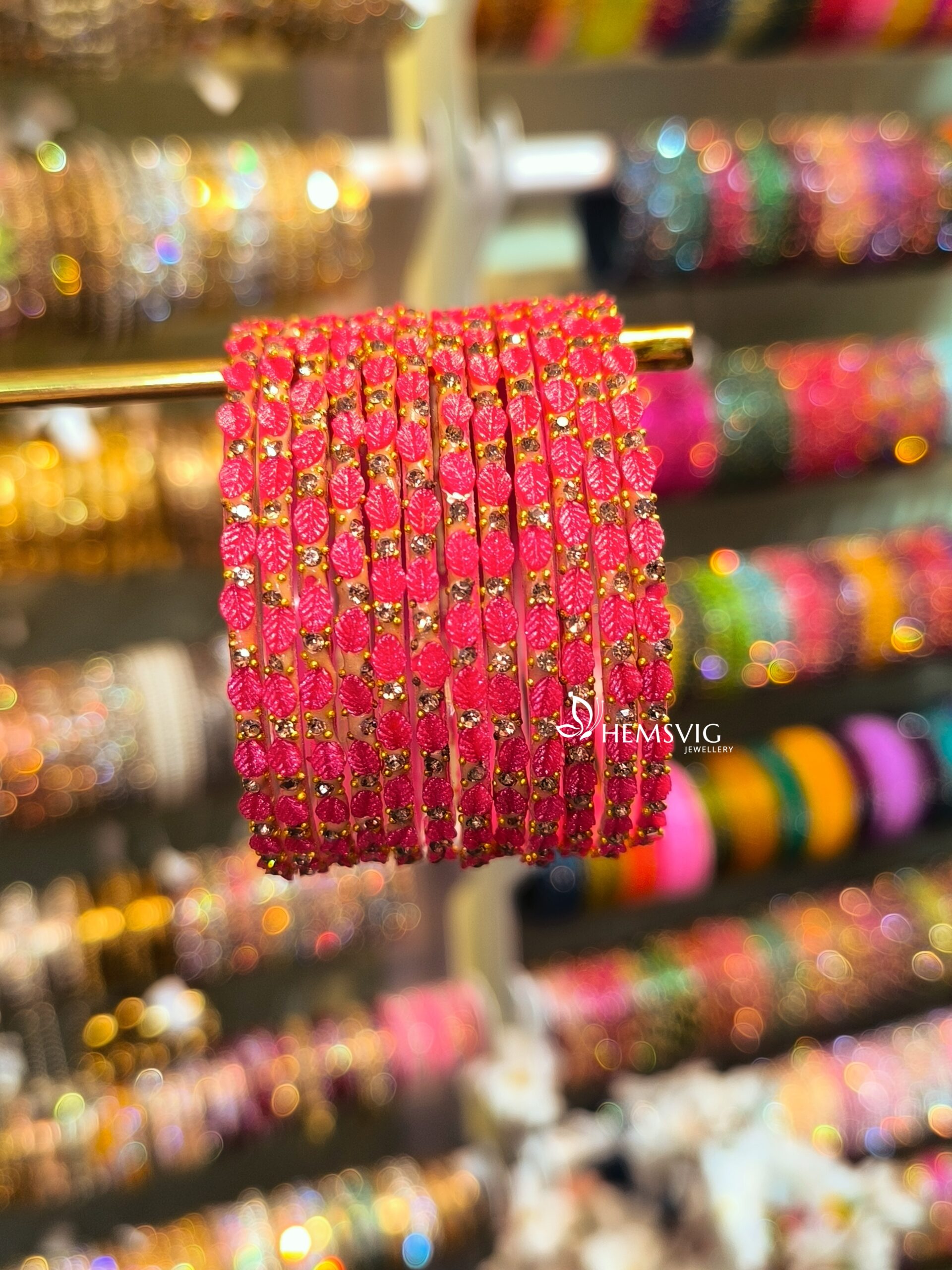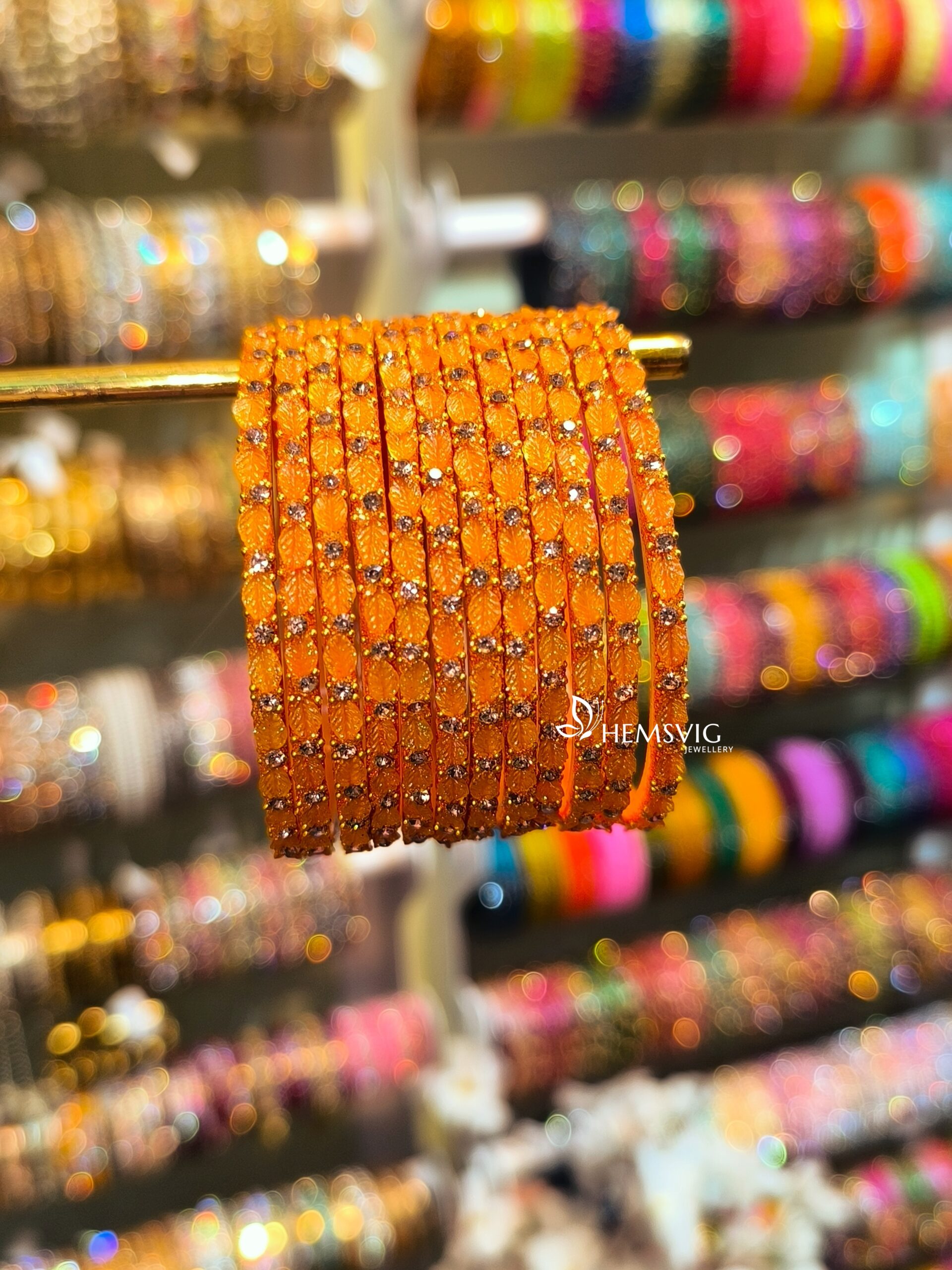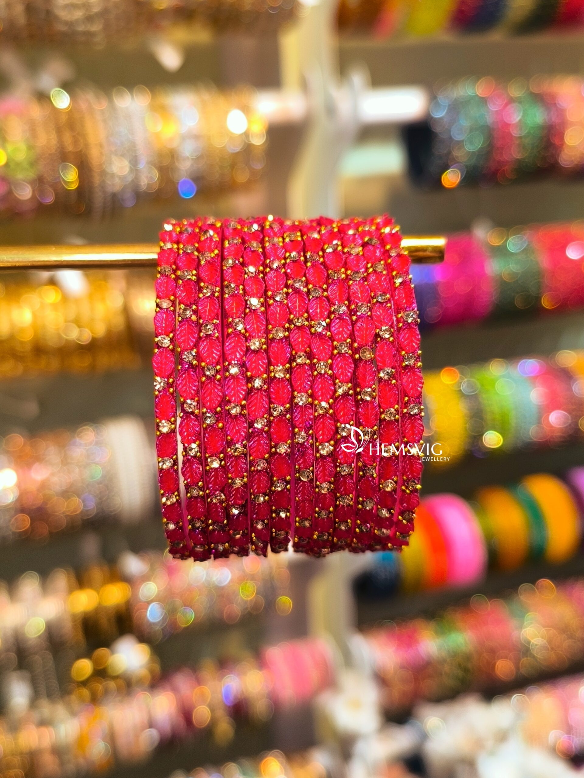 Enhance your traditional look with our Leaf Elegance Glass Bangles, thoughtfully designed to blend charm and craftsmanship. Each bangle features a graceful leaf pattern decorated with shimmering stones and fine beads, adding a refined sparkle to your wrists.