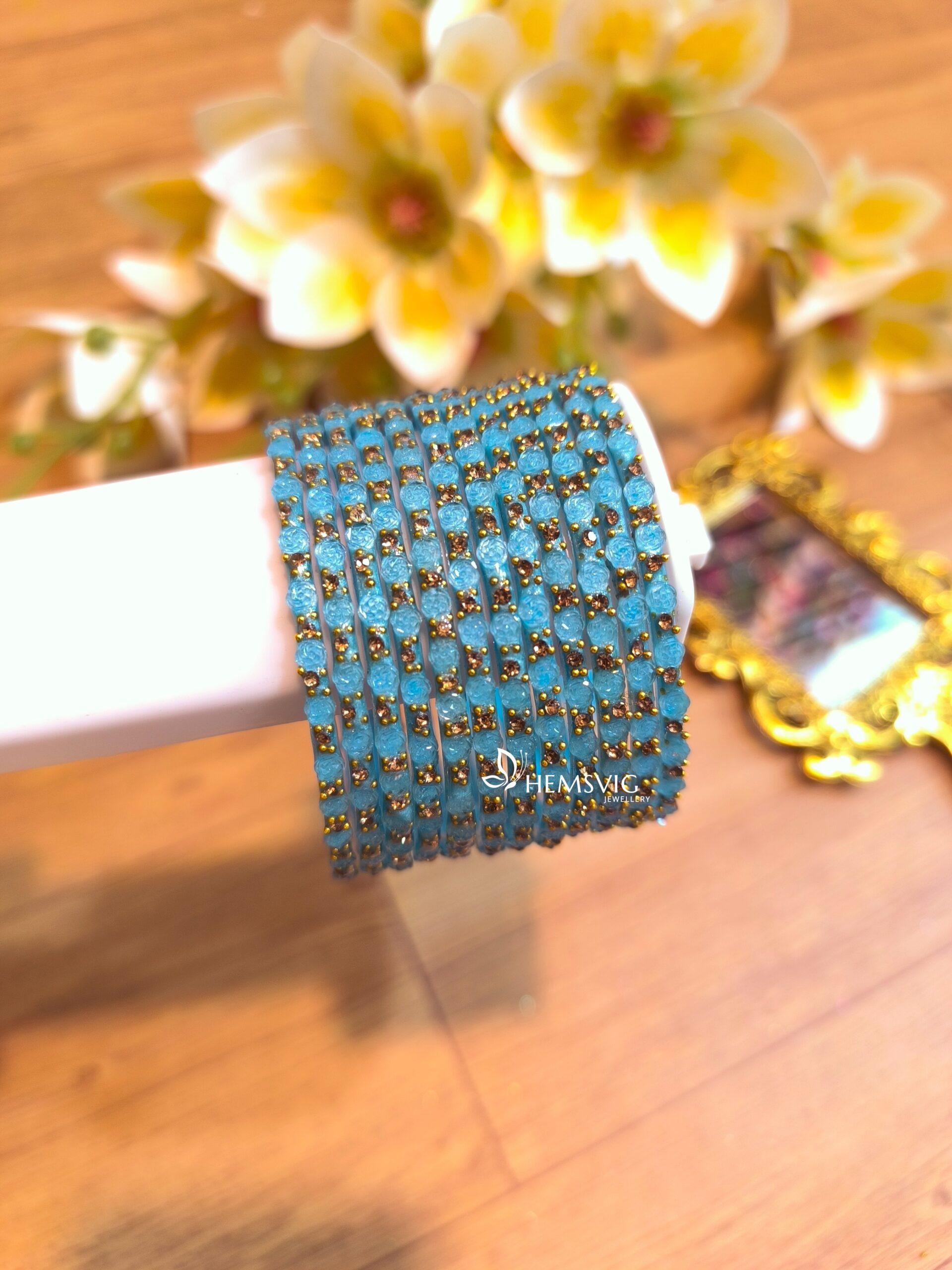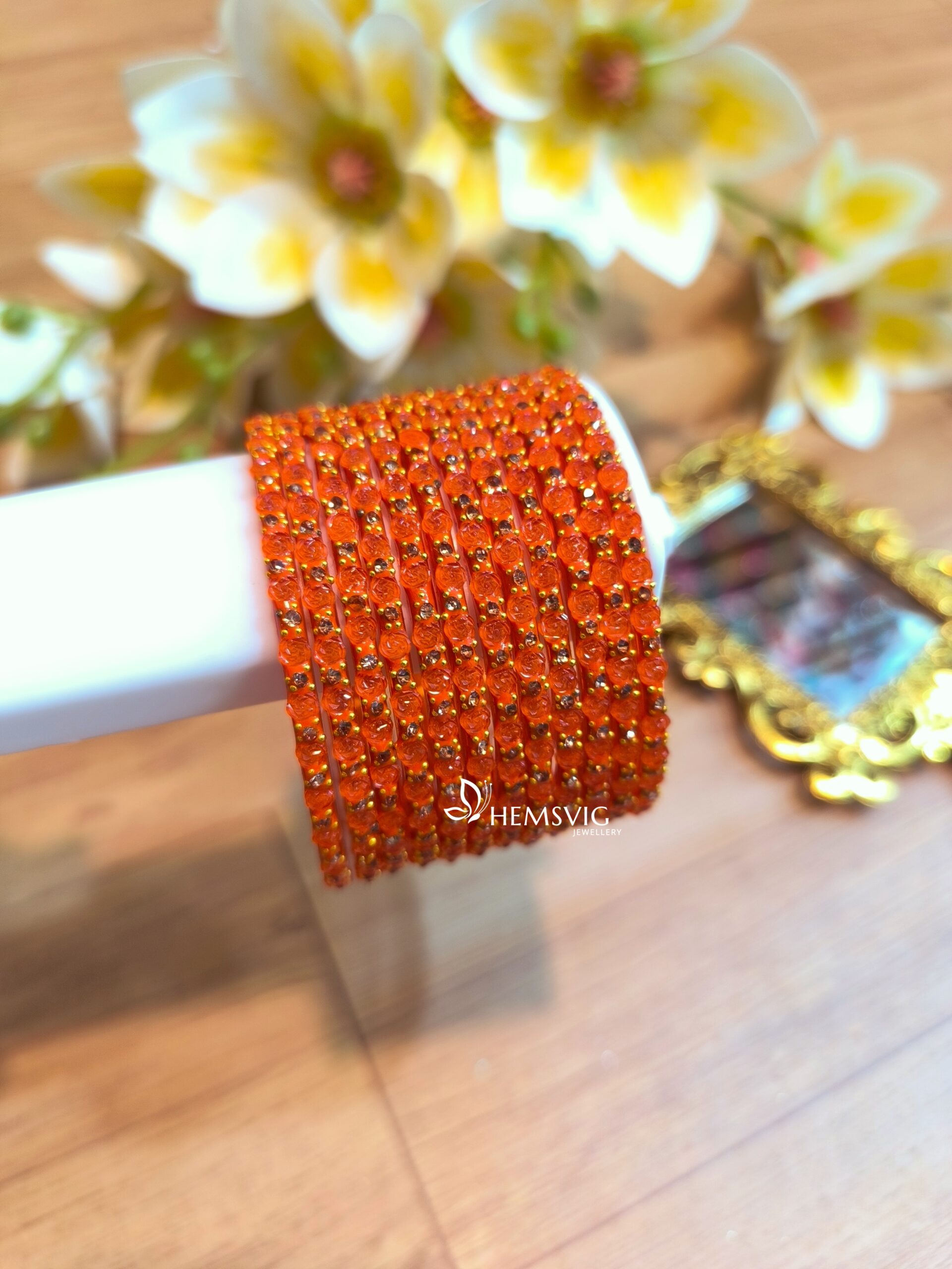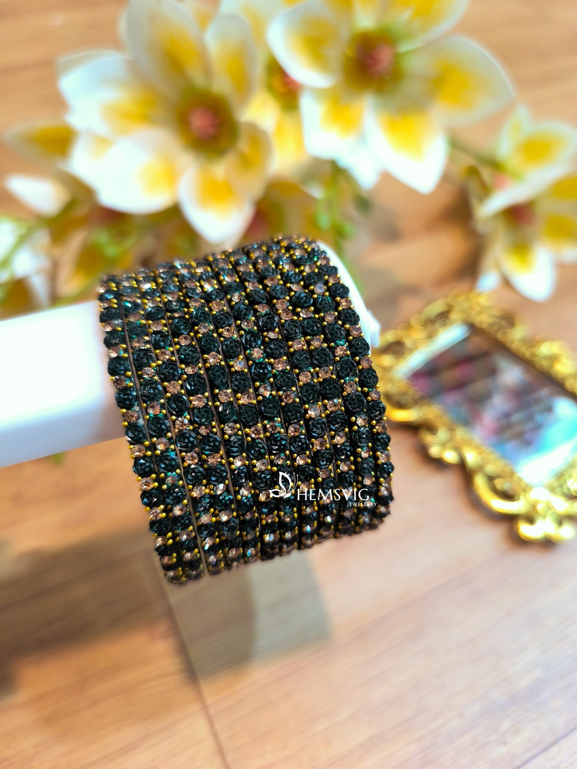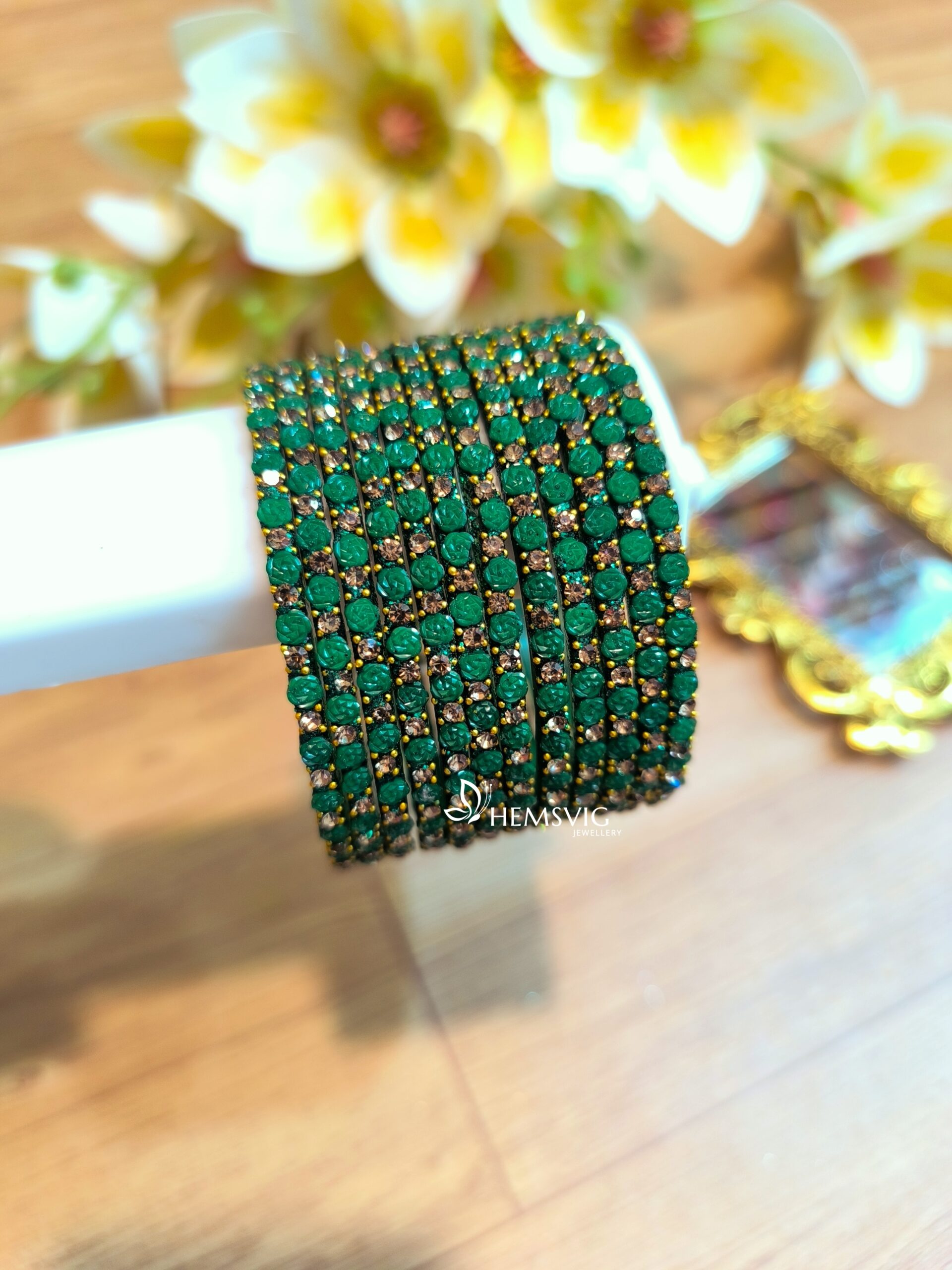 Enhance your traditional style with these stunning crystal-cut glass bangles featuring an elegant rose-inspired design. Expertly crafted with shimmering stones and fine beads, this set brings a luxurious sparkle to your wrist. Ideal for weddings, parties, and ethnic wear — these bangles offer durability, comfort, and beauty that every woman will admire. A perfect gift choice for special occasions and a lovely addition to any jewelry collection.