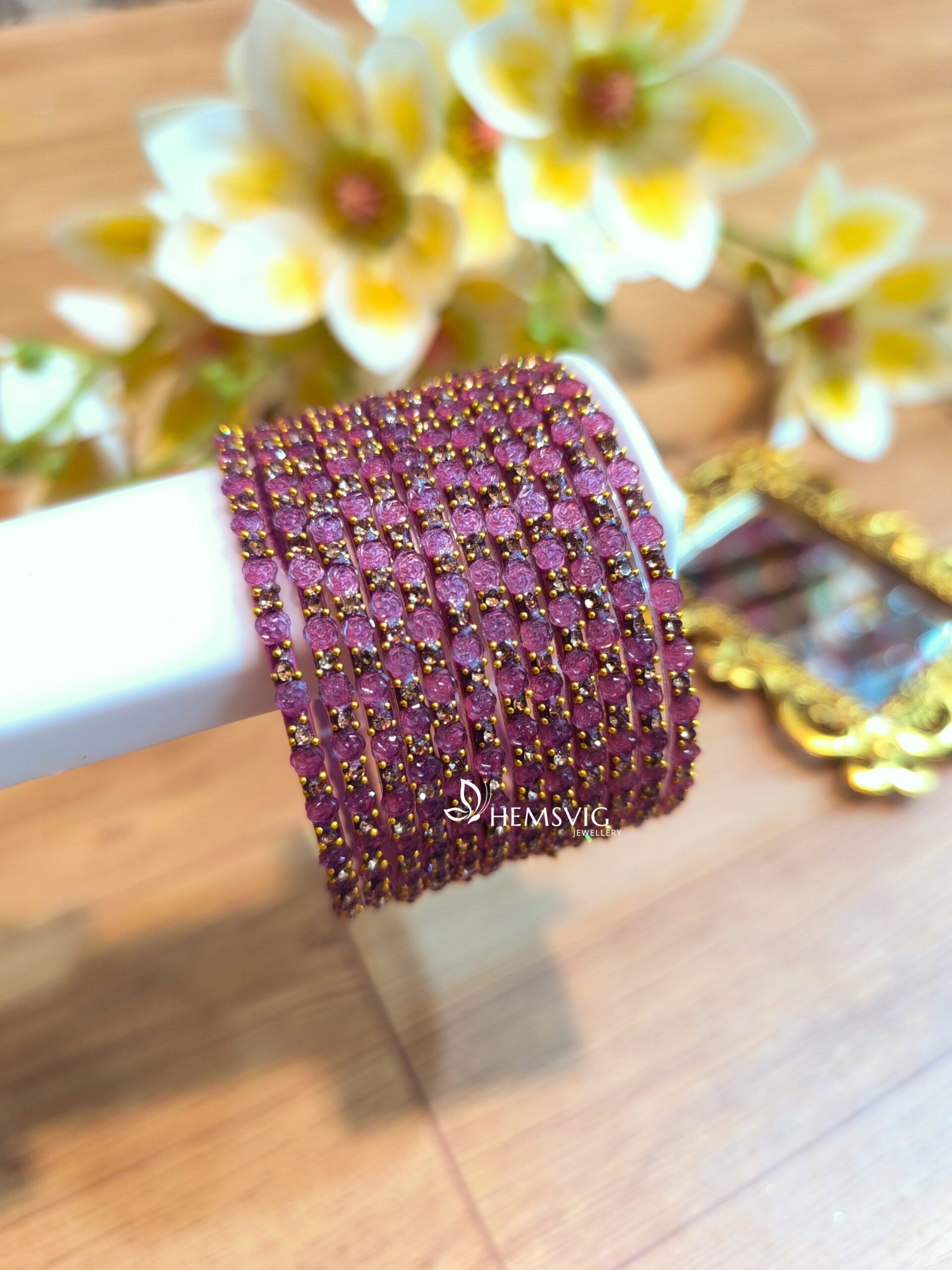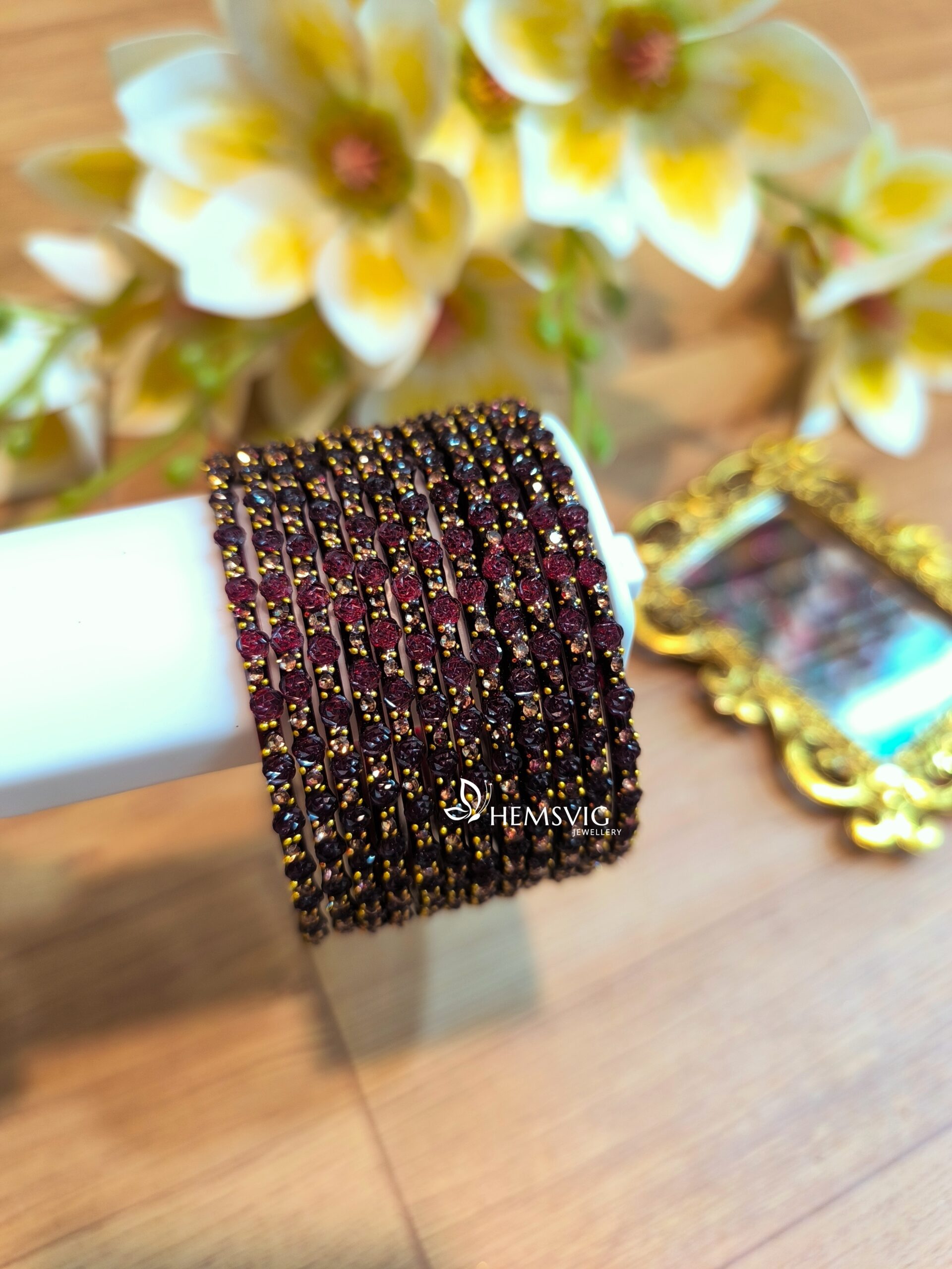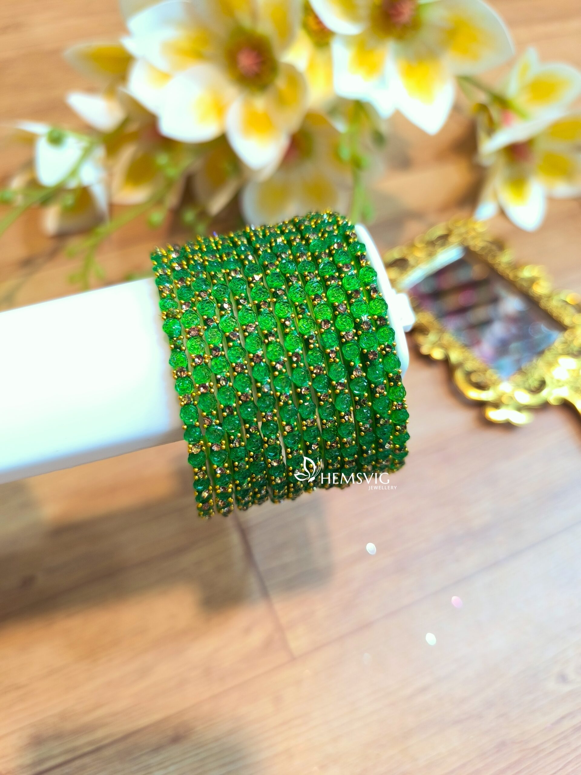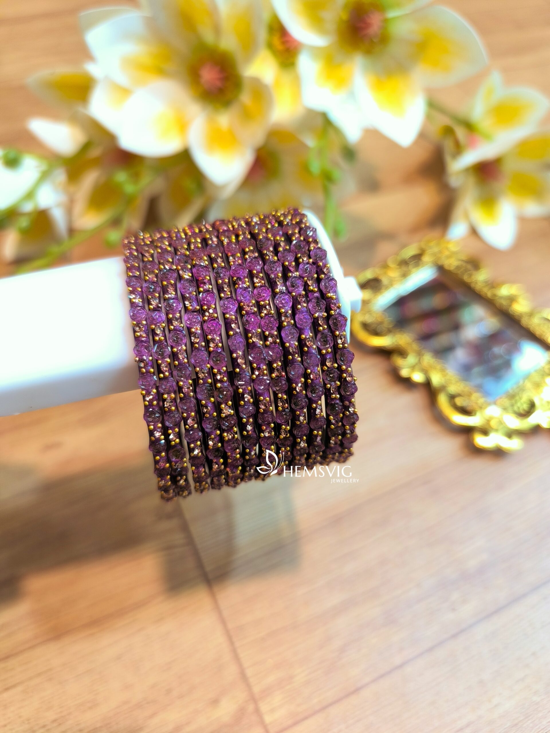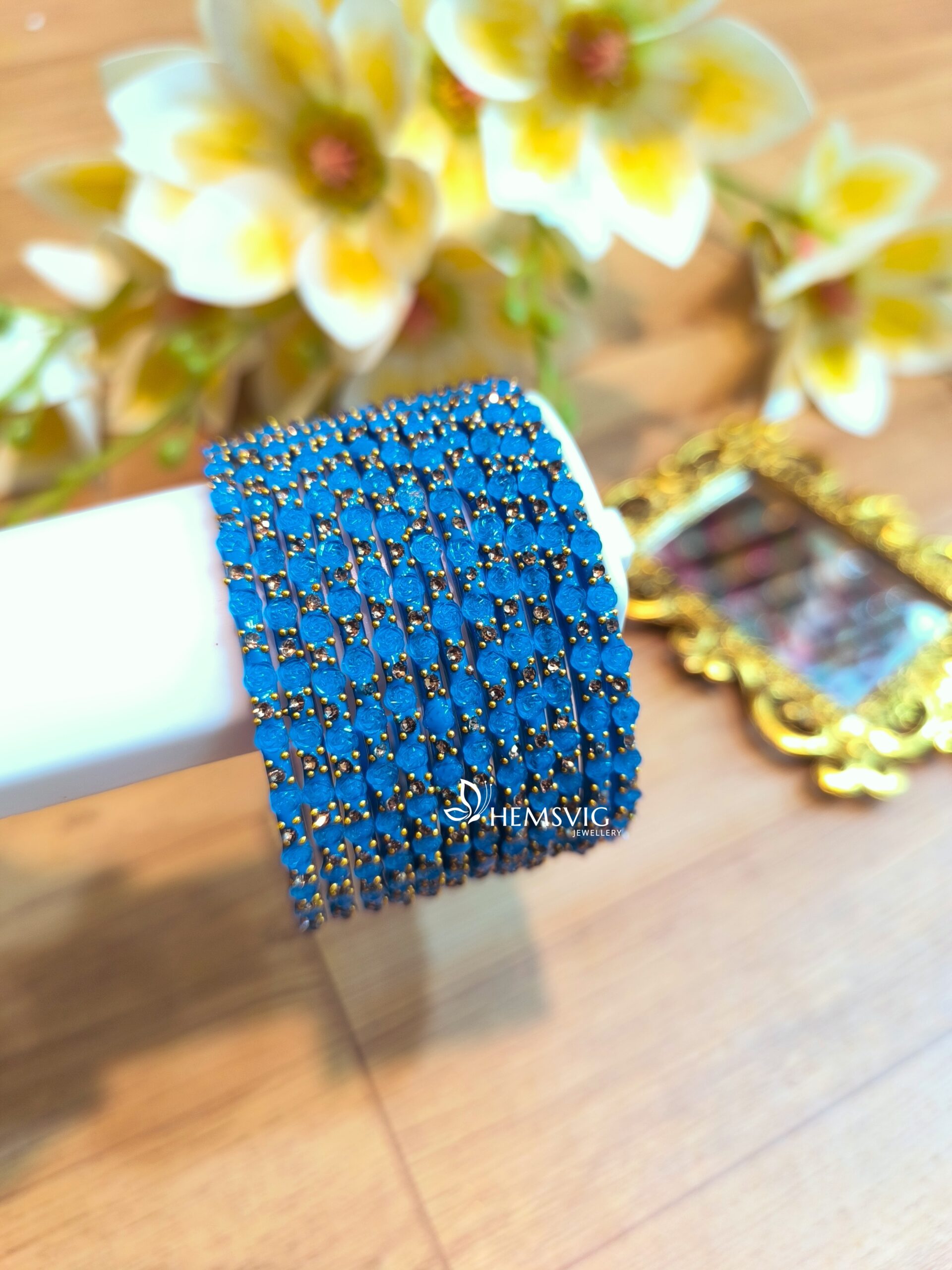Enhance your traditional style with these stunning crystal-cut glass bangles featuring an elegant rose-inspired design. Expertly crafted with shimmering stones and fine beads, this set brings a luxurious sparkle to your wrist. Ideal for weddings, parties, and ethnic wear — these bangles offer durability, comfort, and beauty that every woman will admire. A perfect gift choice for special occasions and a lovely addition to any jewelry collection.