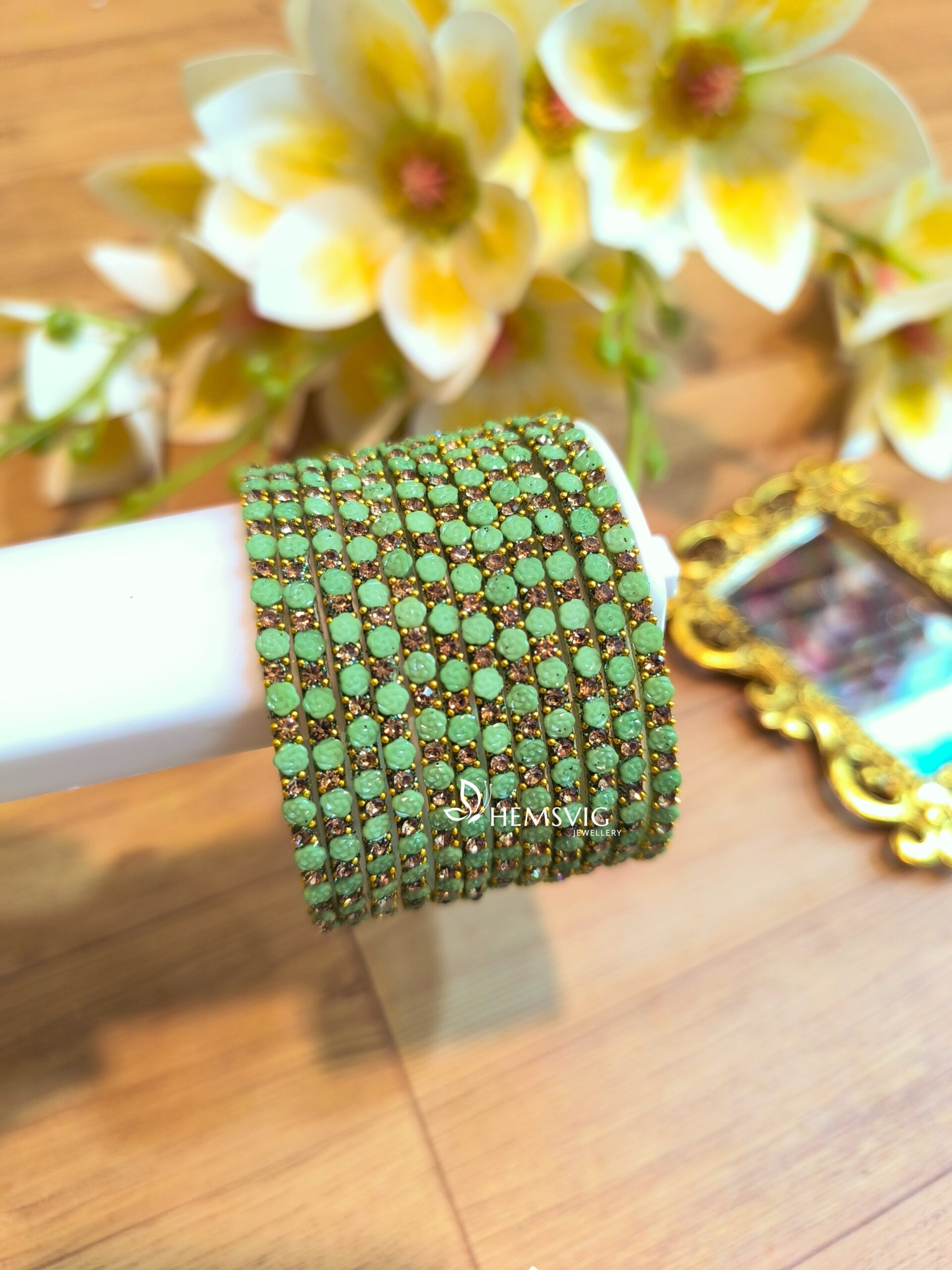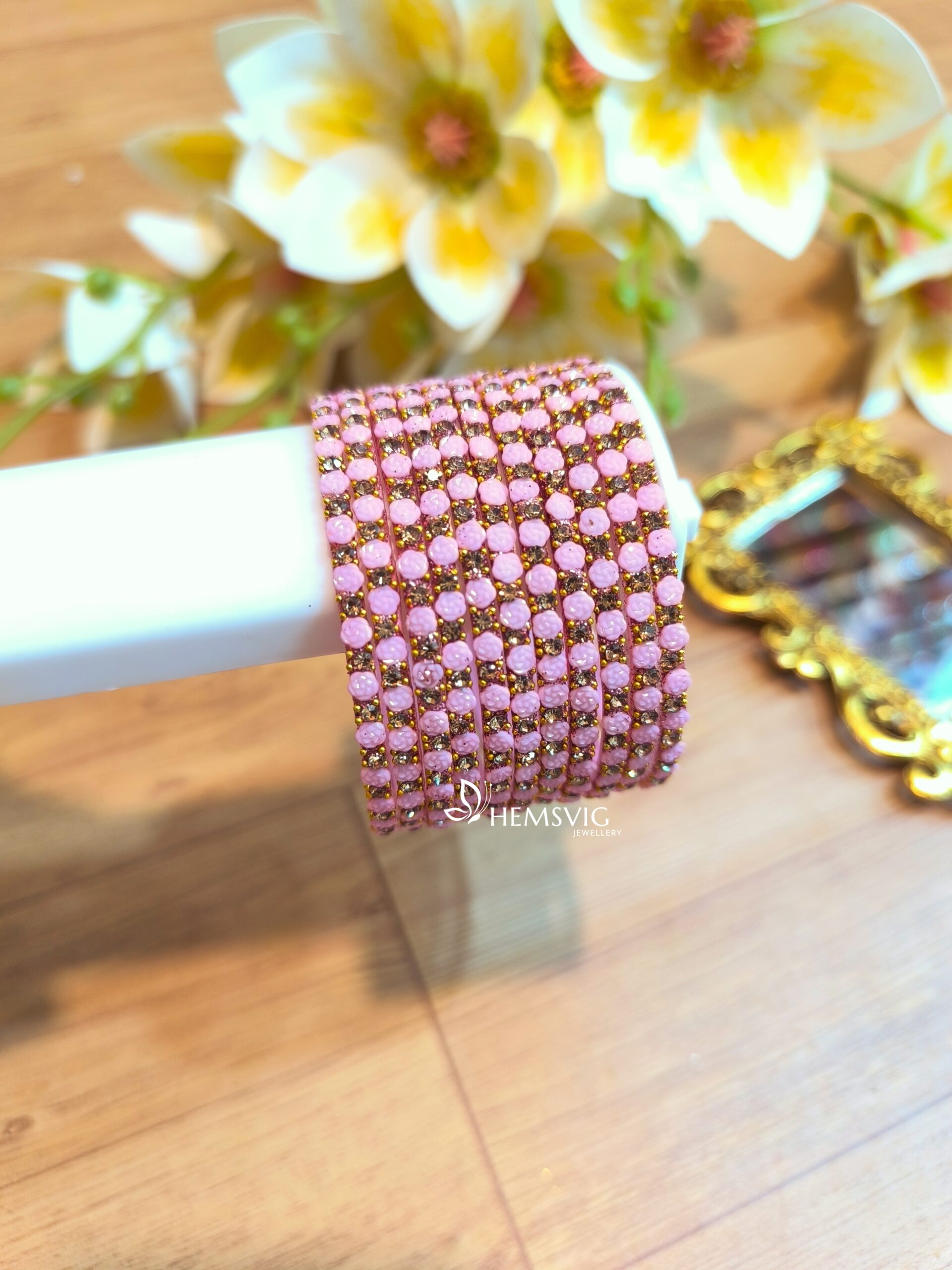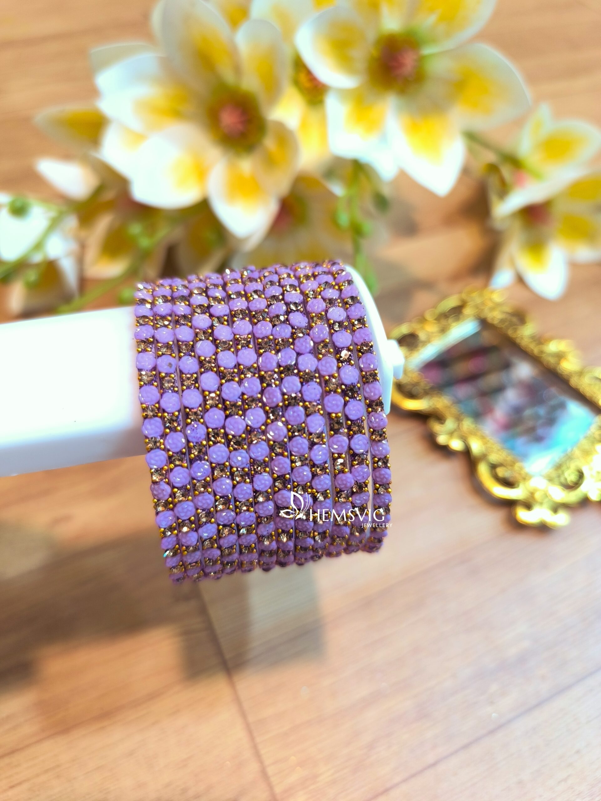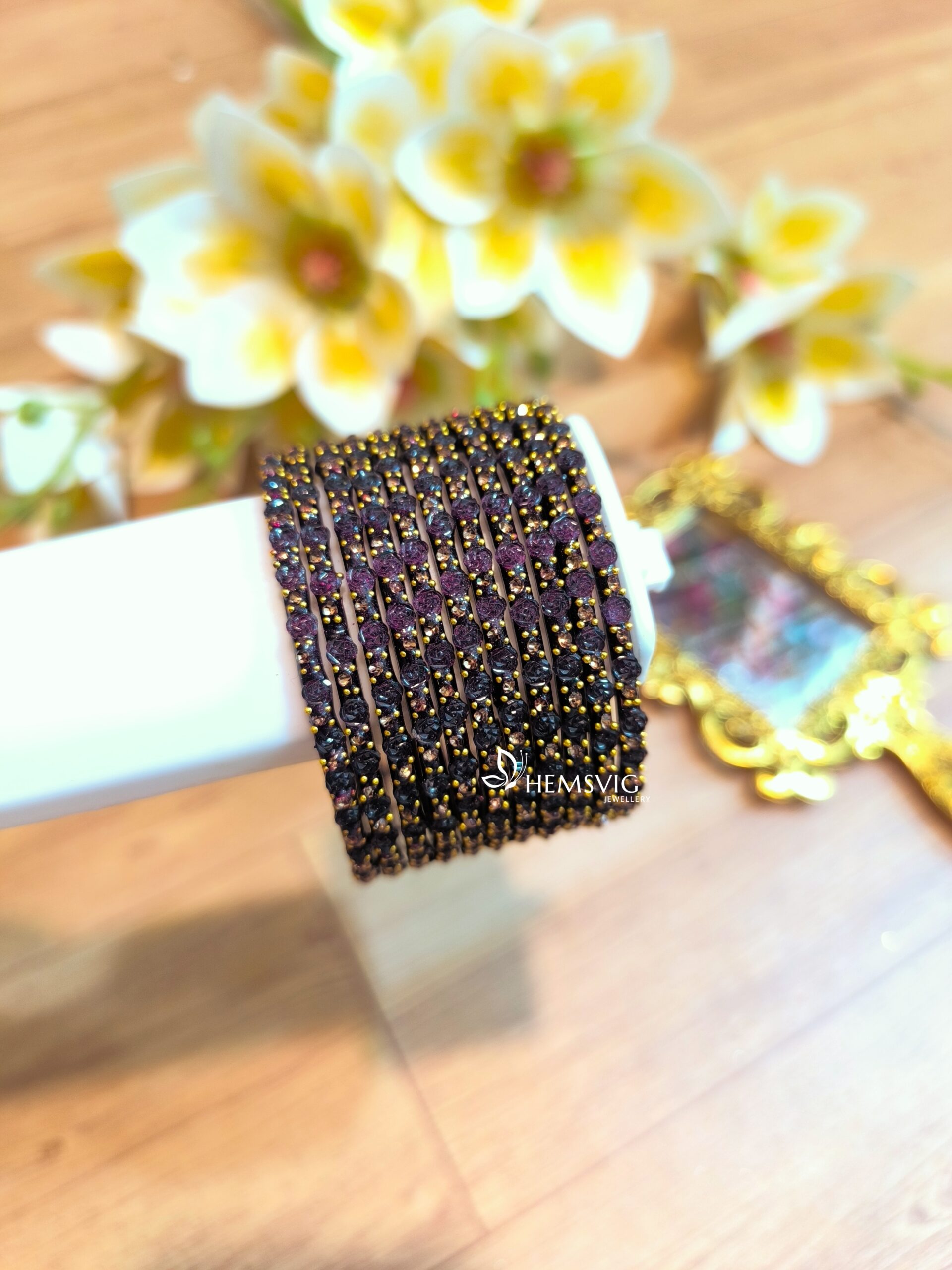 Enhance your traditional style with these stunning crystal-cut glass bangles featuring an elegant rose-inspired design. Expertly crafted with shimmering stones and fine beads, this set brings a luxurious sparkle to your wrist. Ideal for weddings, parties, and ethnic wear — these bangles offer durability, comfort, and beauty that every woman will admire. A perfect gift choice for special occasions and a lovely addition to any jewelry collection.