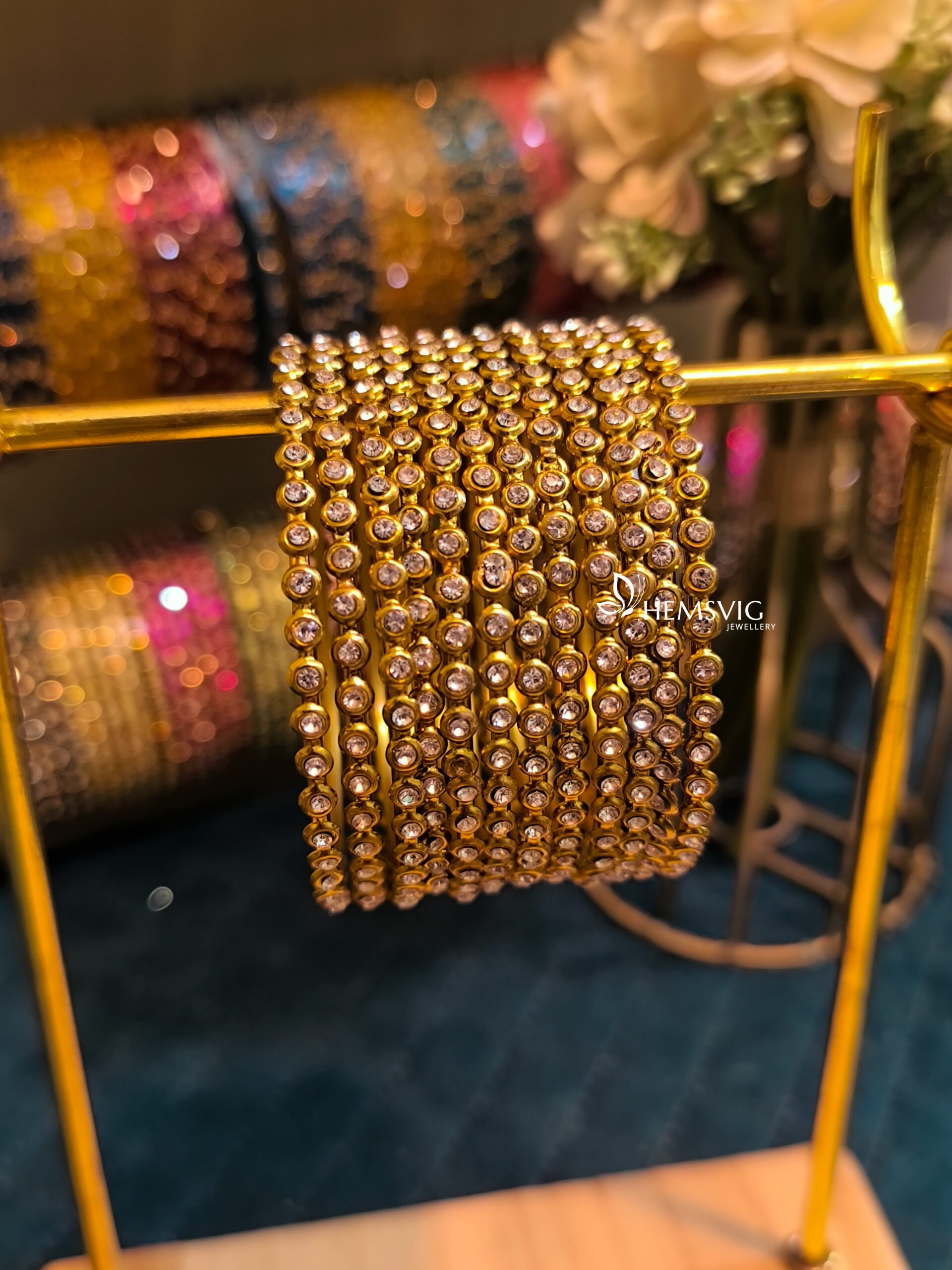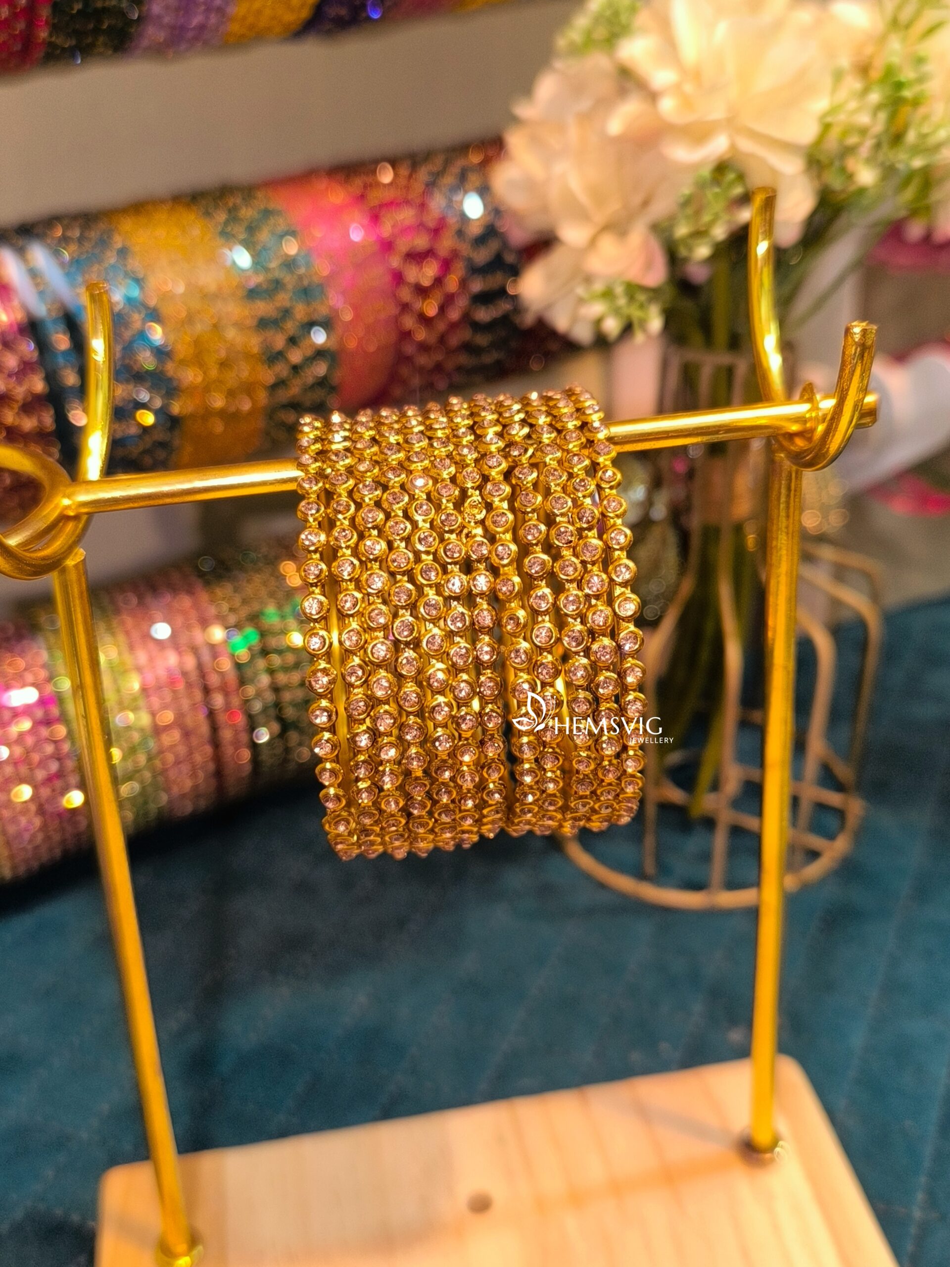 Premium metal bangles embellished with sparkling stones, available in LCD and Gold finishes. Each set includes 12 bangles, perfect for daily and festive styling.