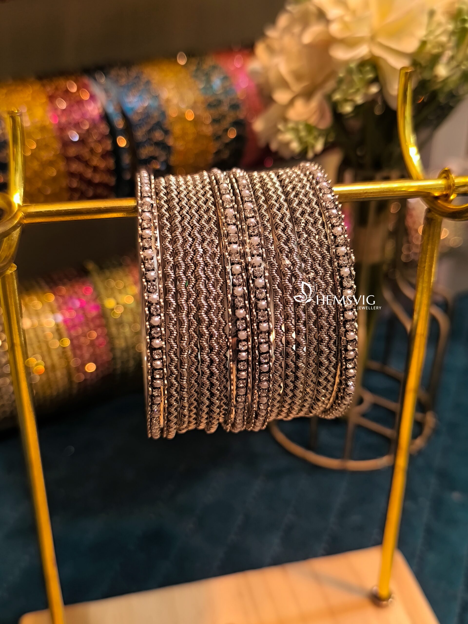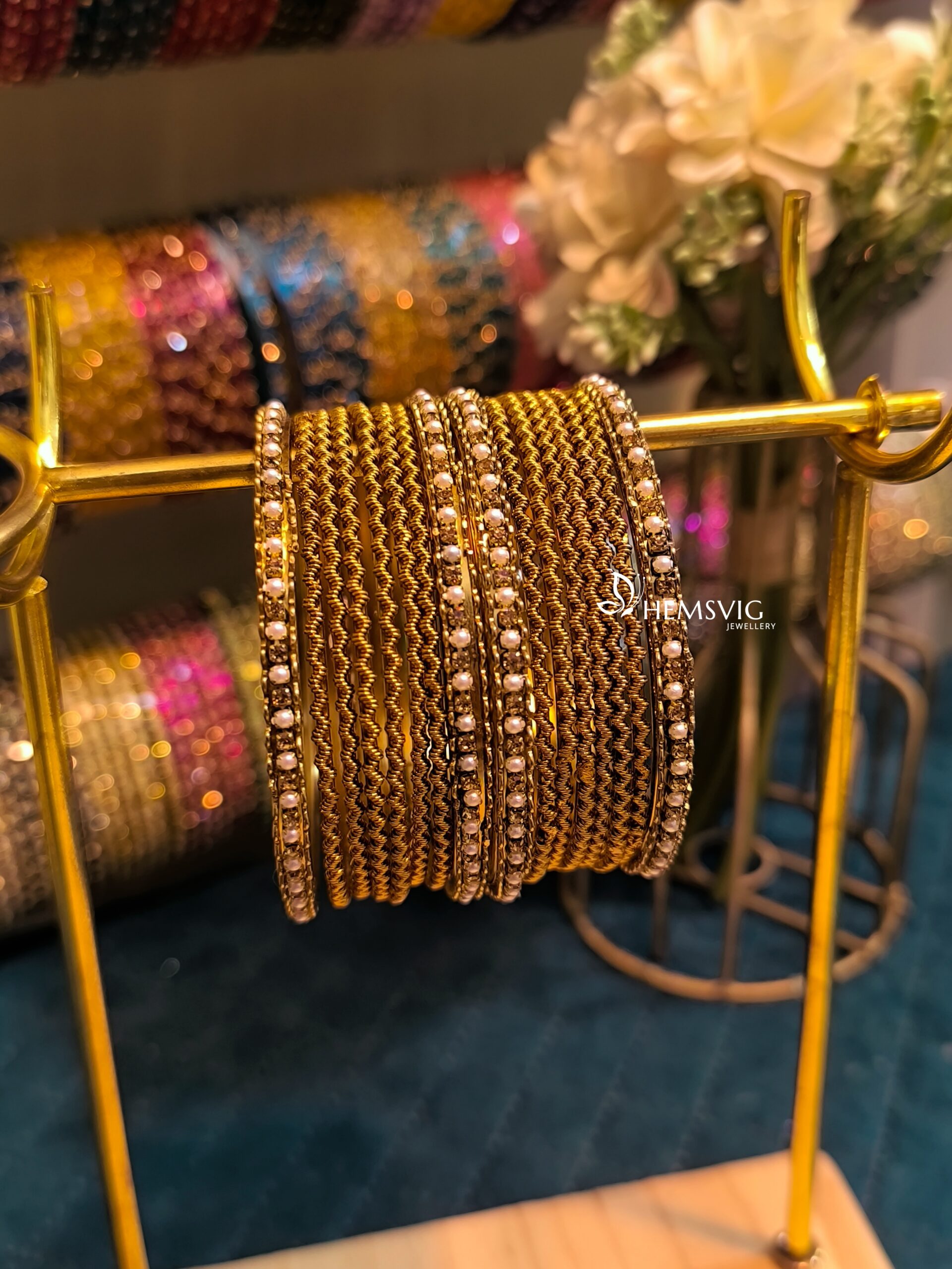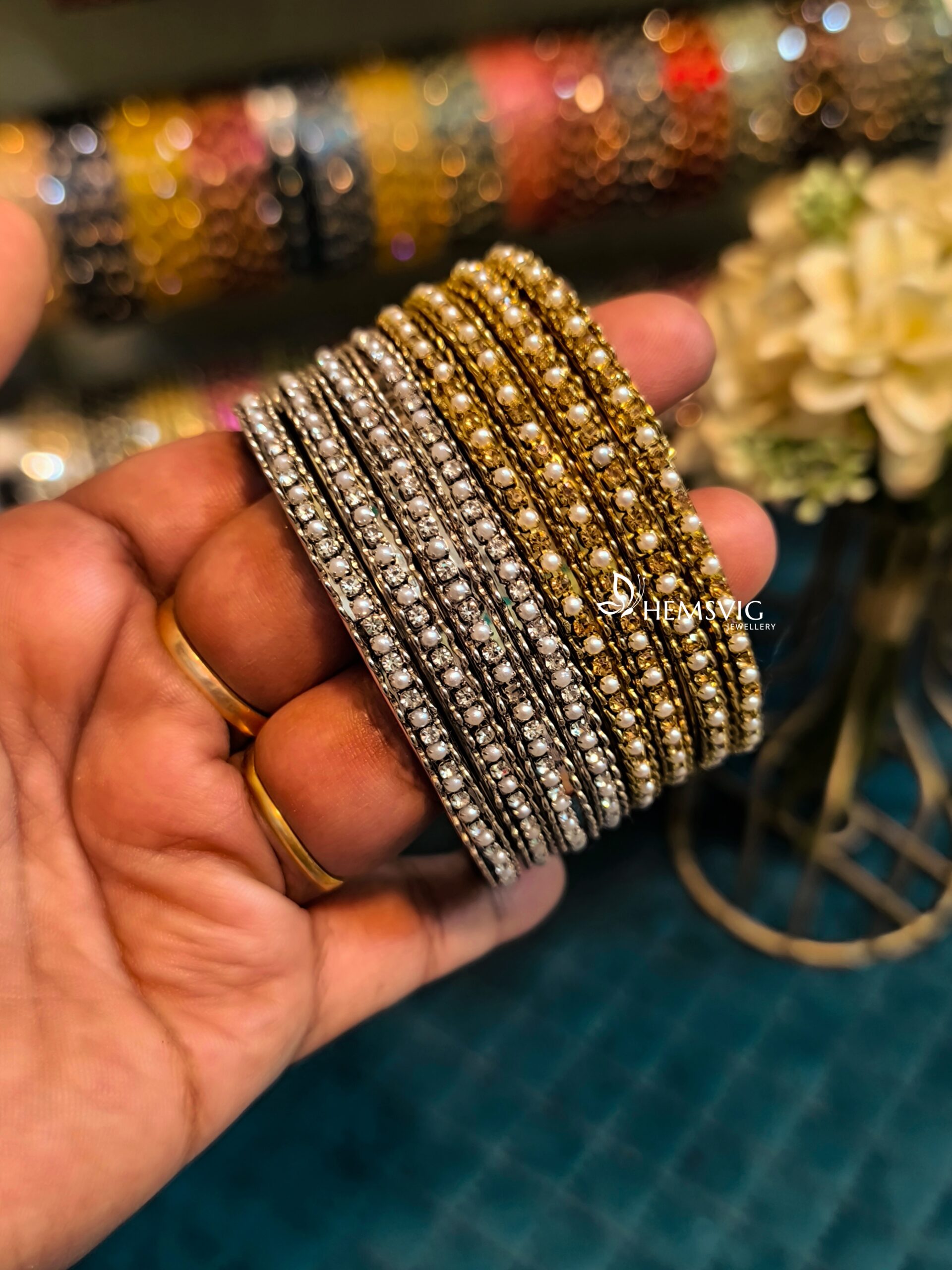 Beautifully crafted metal bangles embellished with sparkling stones and elegant pearls. Comes as a set of 4 — perfect for festive and party wear.